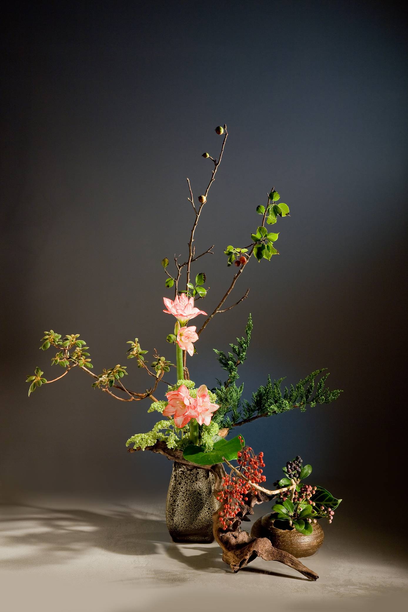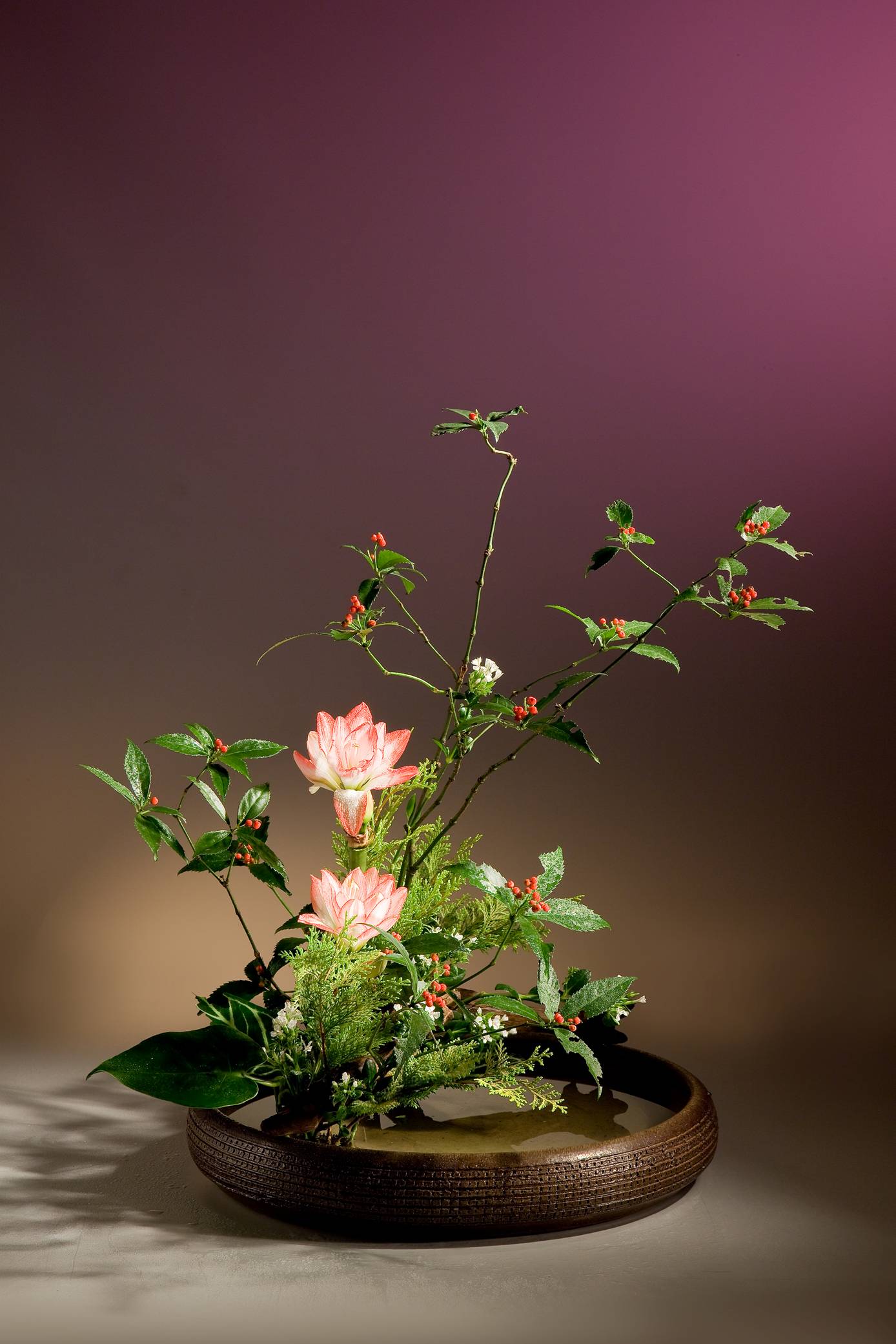 花材:千兩、孤挺花、火鶴葉、柏、火鶴葉