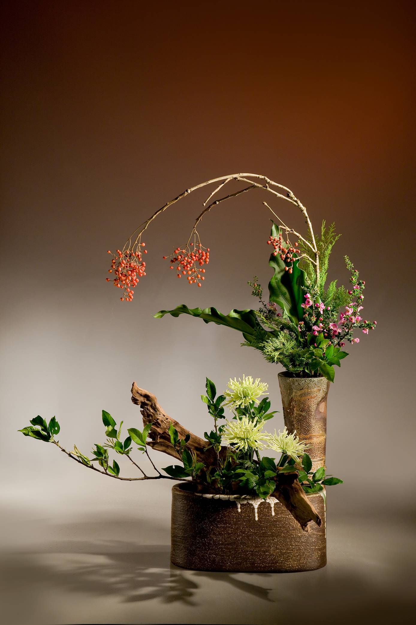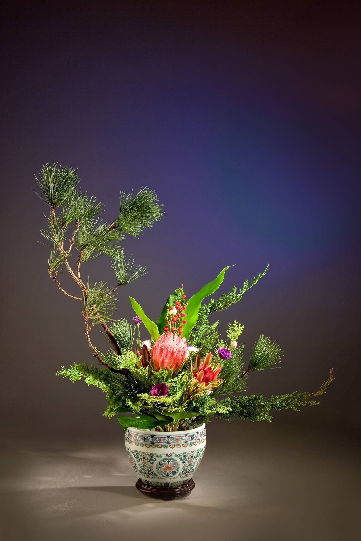 萬物各具一理,而萬理同出一源,證於缸花之插作,花材有松、