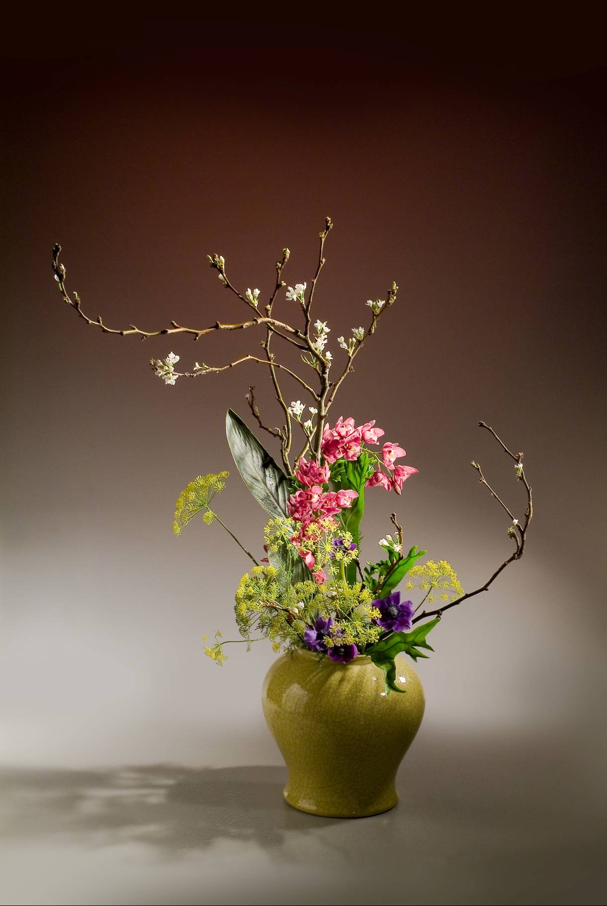 梨花點點春訊,茴香、東亞蘭、白頭翁染成一片新色,陶器中迎來千般春色。