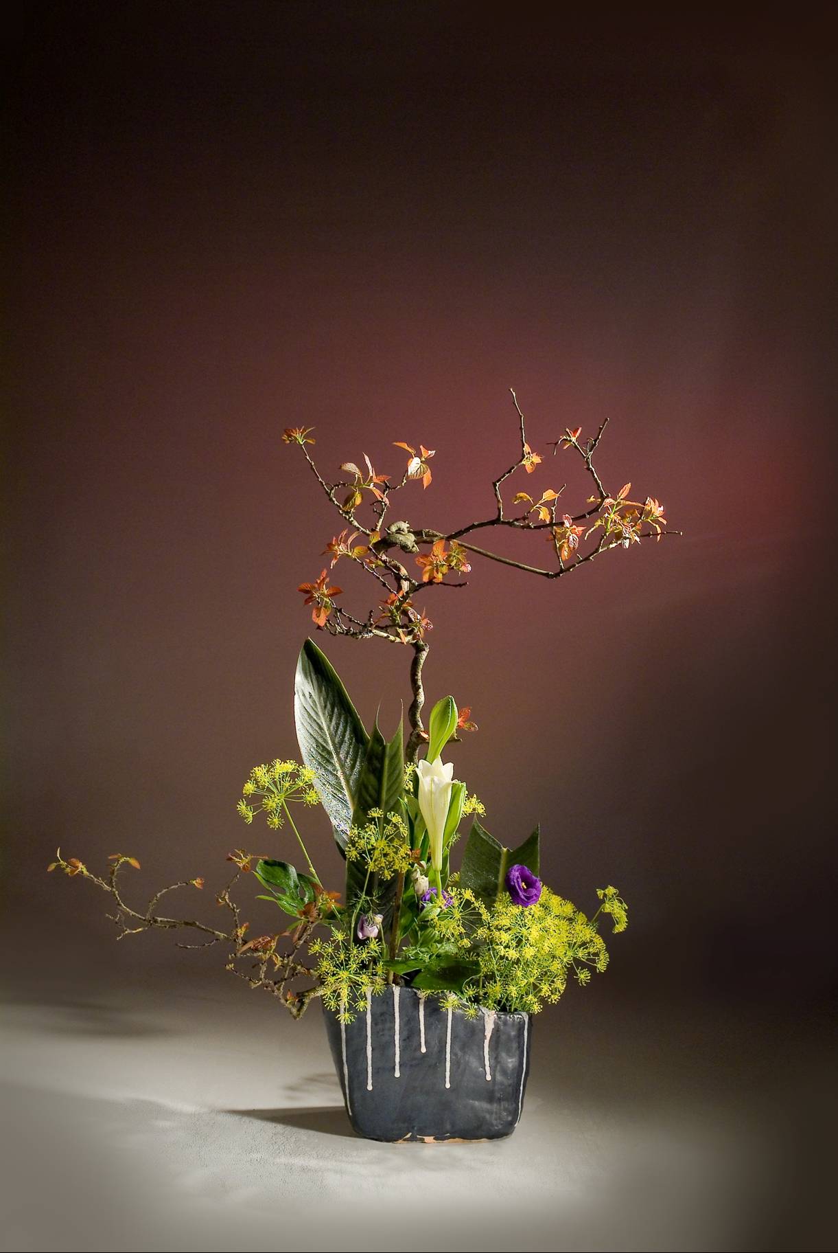花材:獼猴藤、鐵砲百合、茴香、紫桔梗、天堂鳥葉、電信蘭