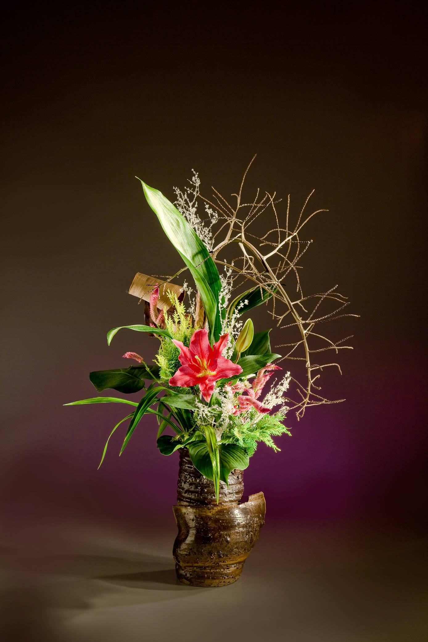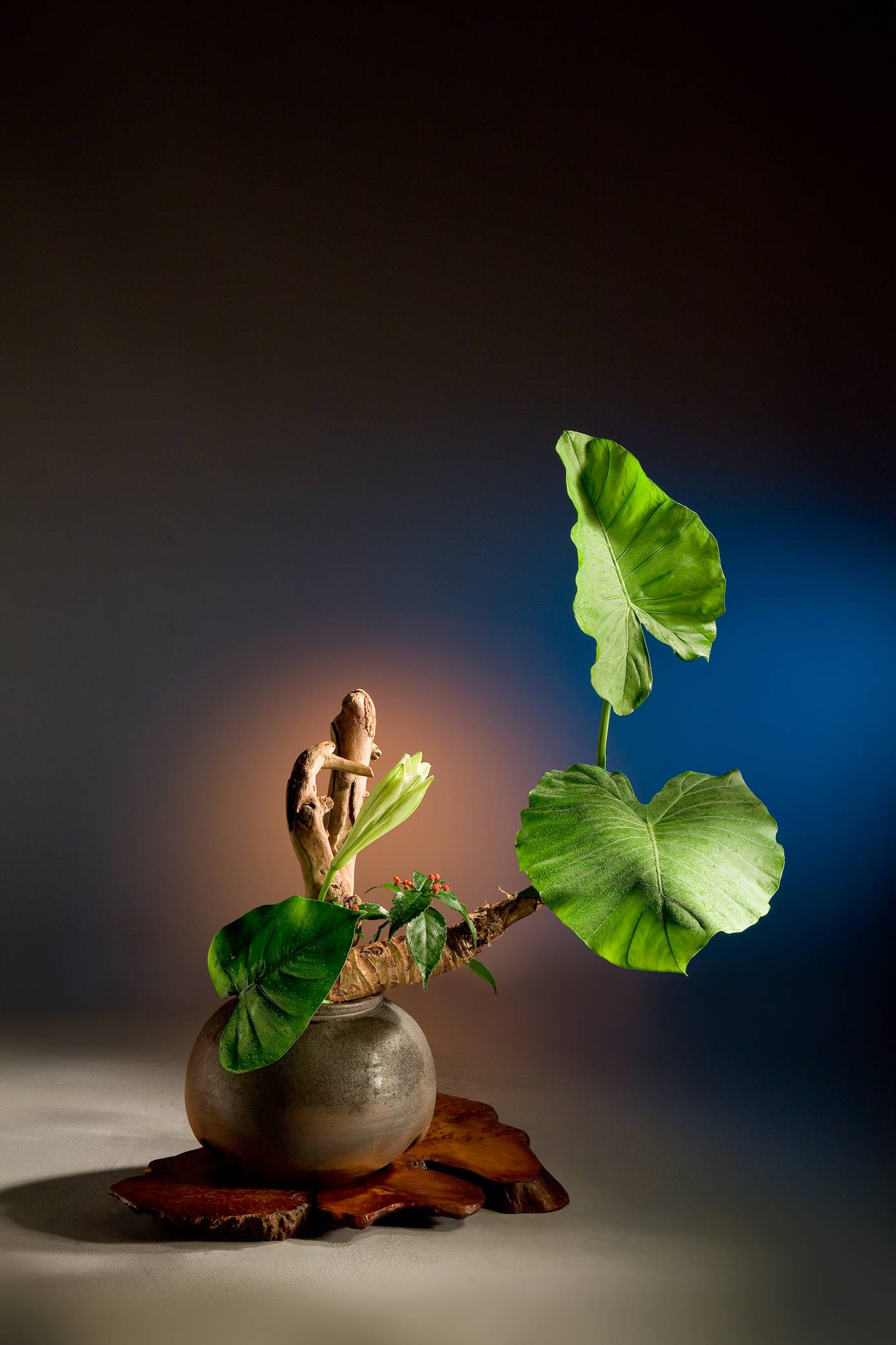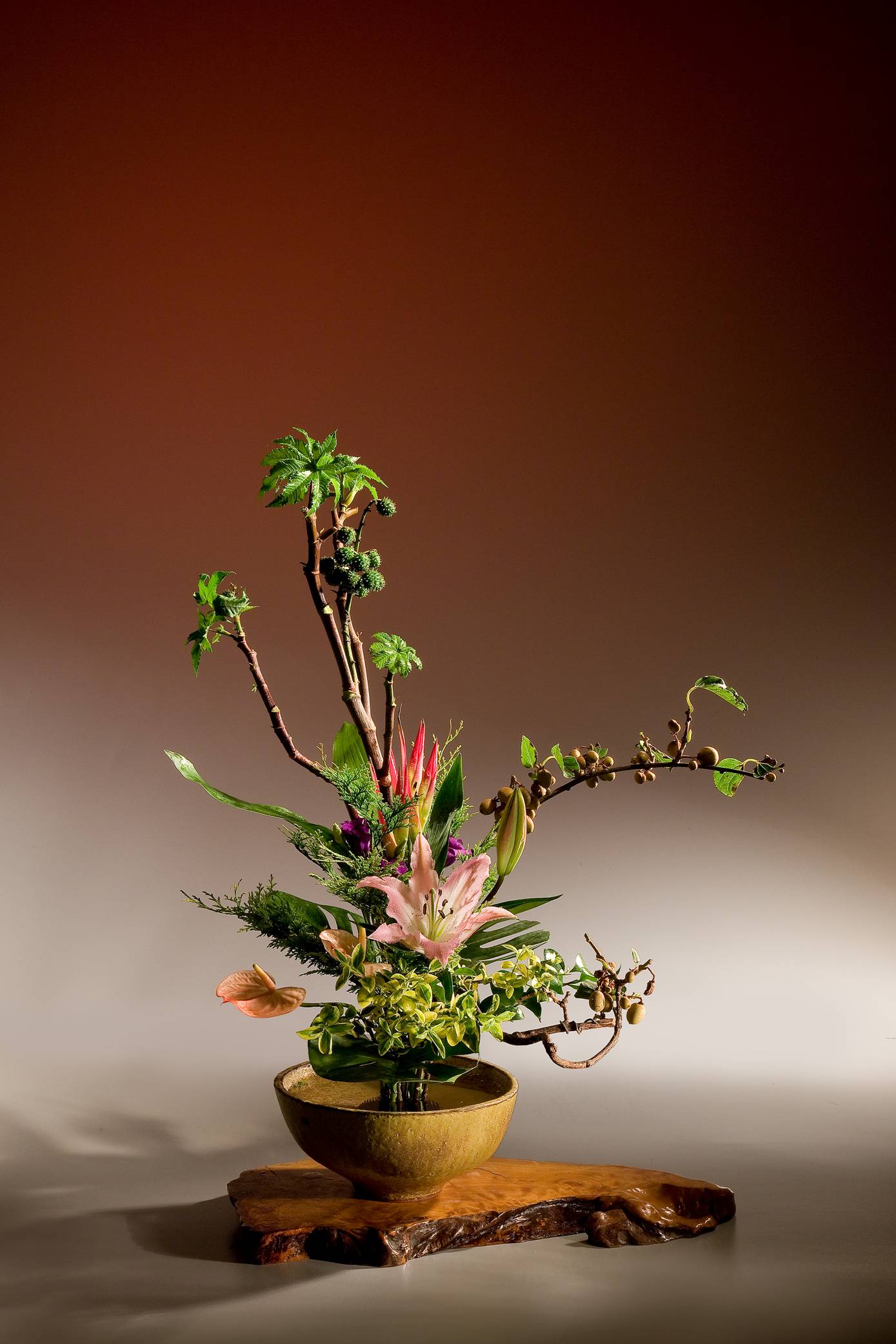 花材:姑婆芋葉、千兩、百合、火鶴葉