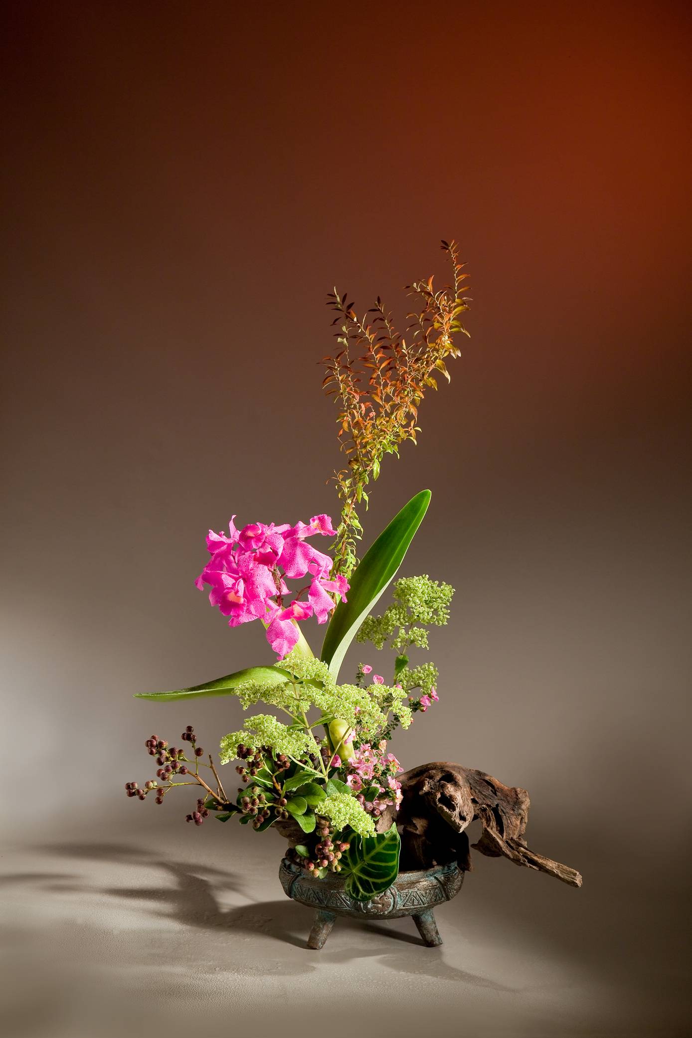 花材:紅桐子、山蘇、黃枝、綠絲菊、柏、史考梅、波浪火鶴葉、枯木