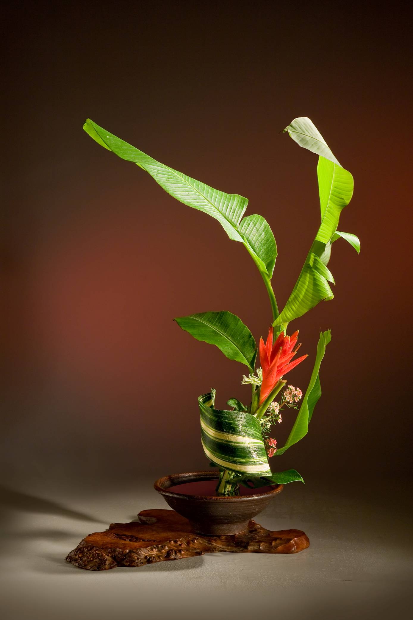 花材:美人蕉、香蕉葉、臘梅、葉蘭、電信蘭