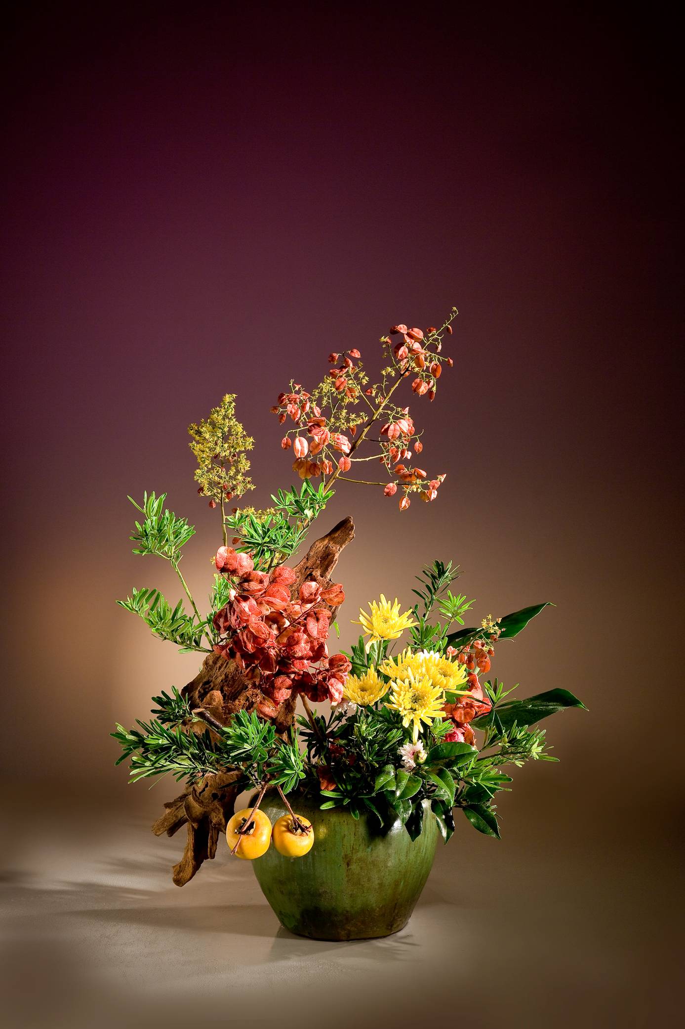花材:台灣欒樹、柿子、羅漢松、八暖菊、山茶花、柏、小菊
