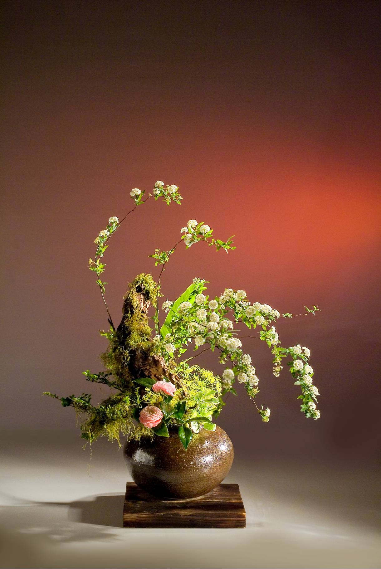 花材:小手毬、苔黃楊、美人蕉葉、茶花、茴香、紫陽芽、苔、枯木