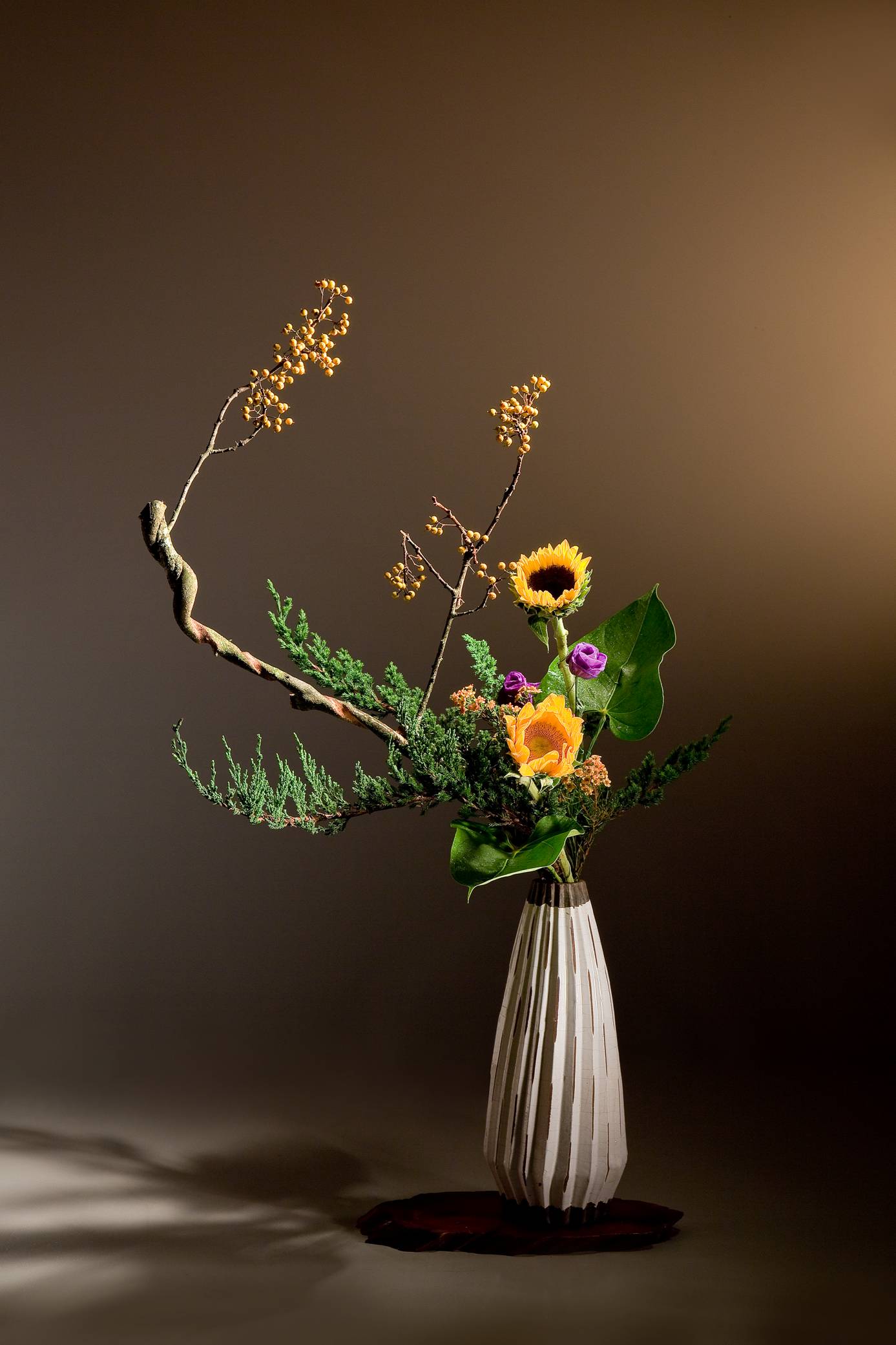 花材:蔓梅擬、向日葵、臘梅、桔梗、火鶴葉、海穗