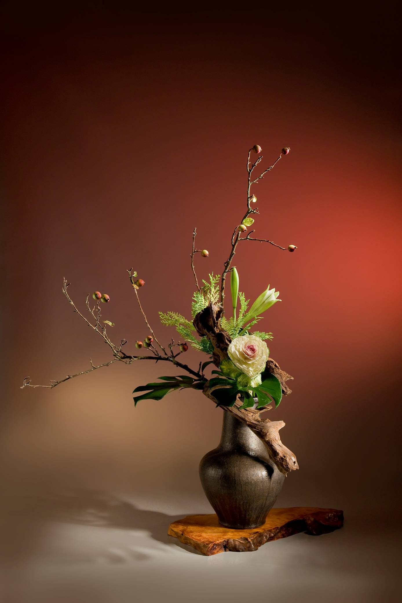 花材:山蘋果、葉牡丹、百合、電信蘭、柏、枯木