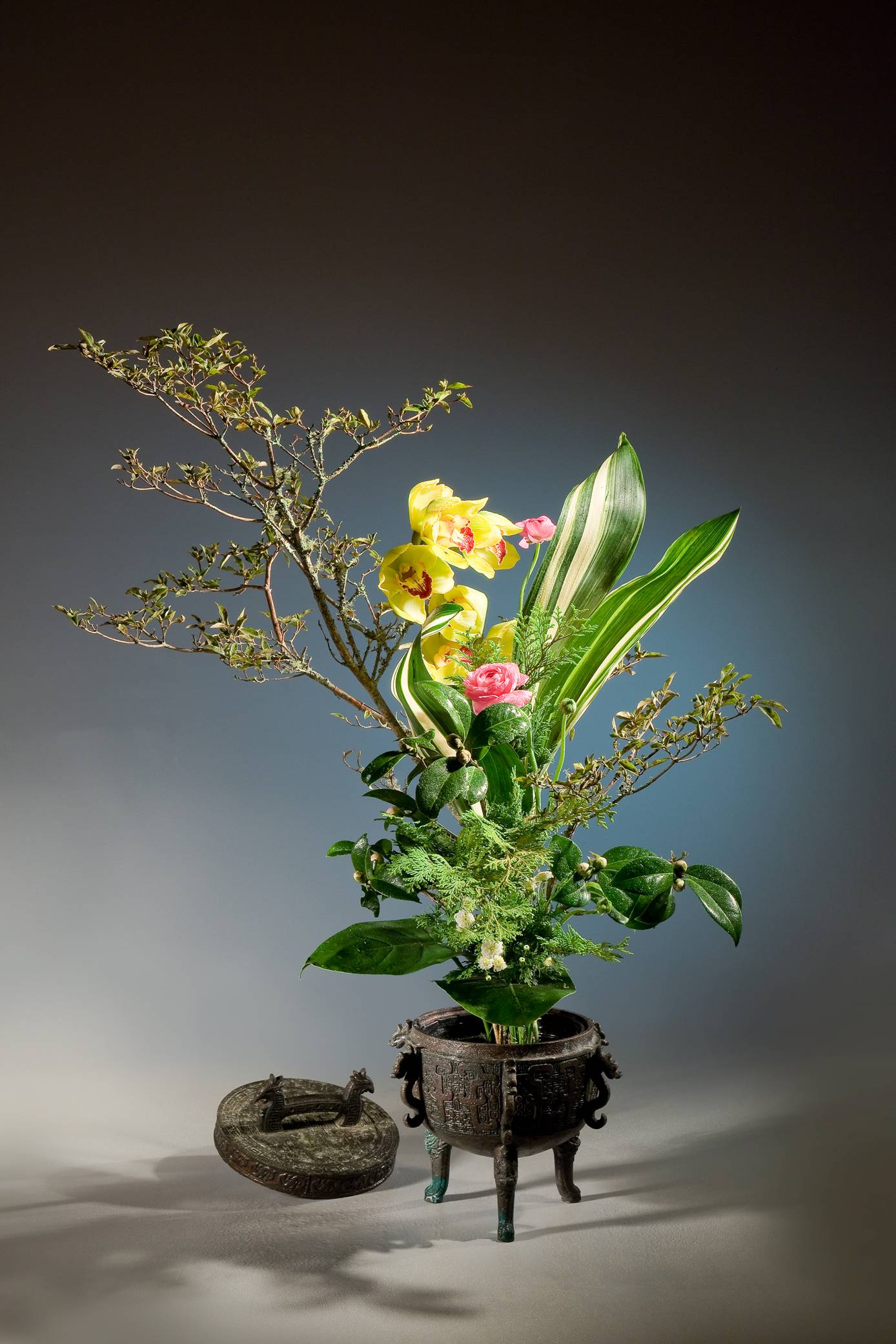 花材:杜鵑、東亞蘭、葉蘭、蘭、柏、山茶、陸蓮、芋葉