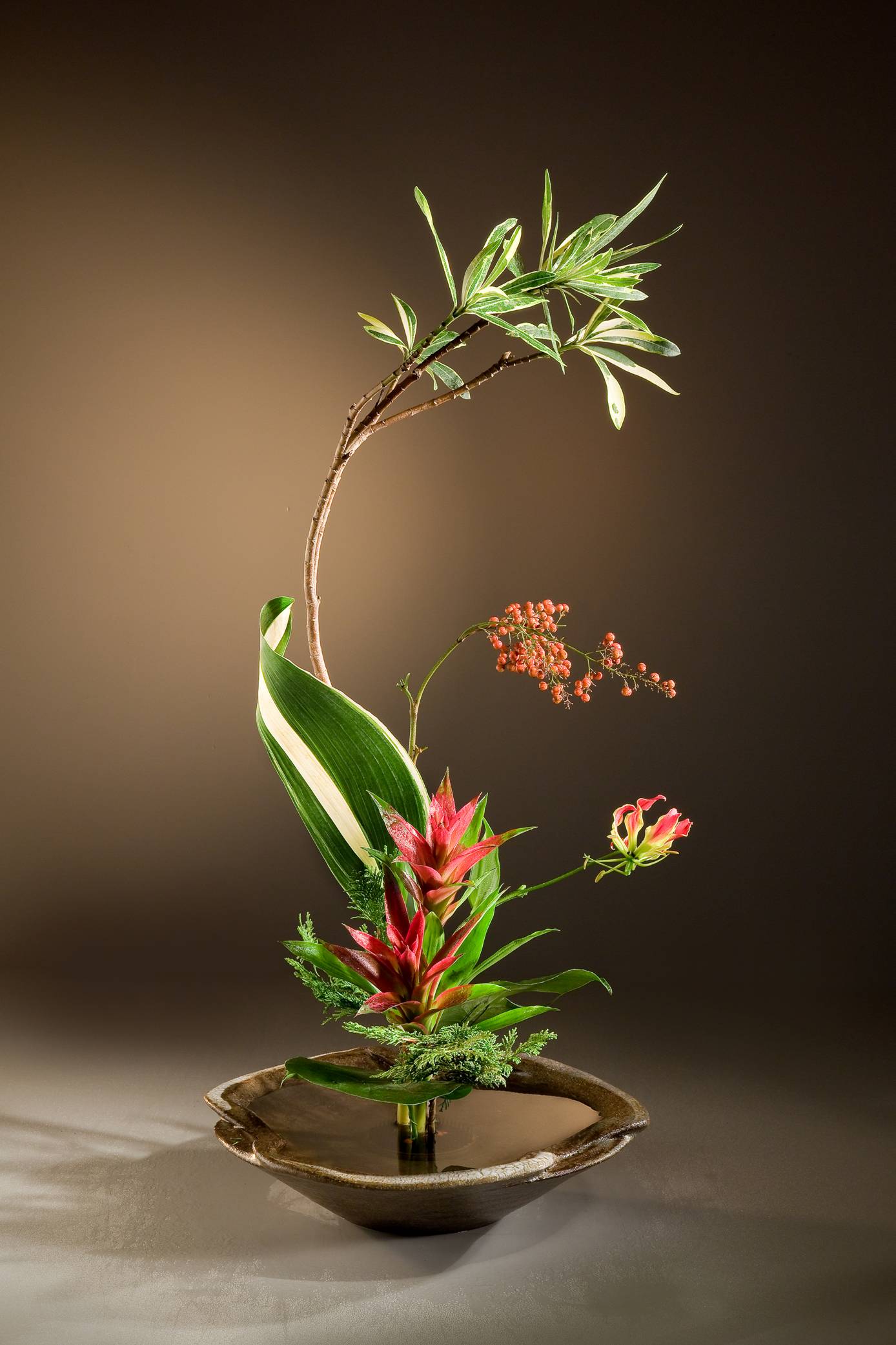 花材:葉蘭、觀賞鳳梨、柏、電信蘭、南天果實、夾竹桃、火焰百合