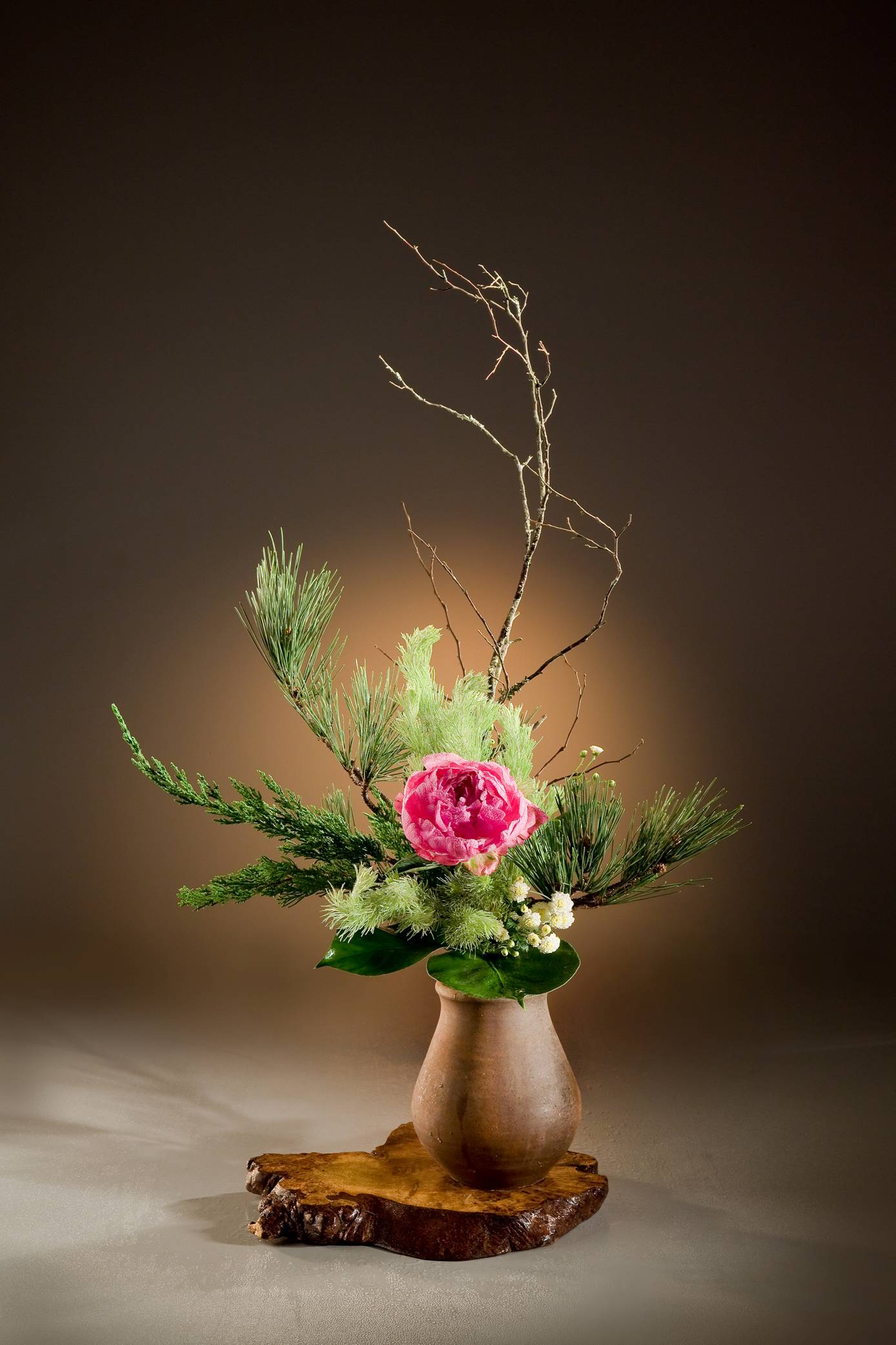 超過綠葉為原則,以羊毛松、松、電信蘭之多層次,襯托主花芍藥之紅,
