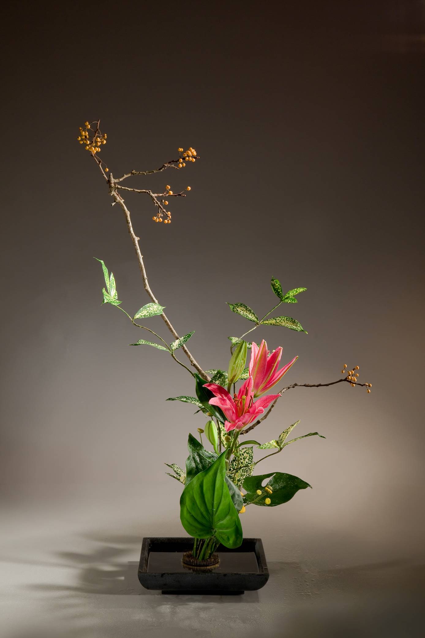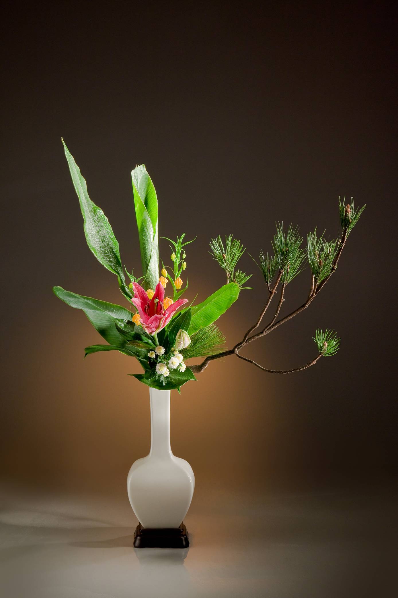 花材:松、千兩、鐵砲百合、芍藥、海芙蓉、陸蓮