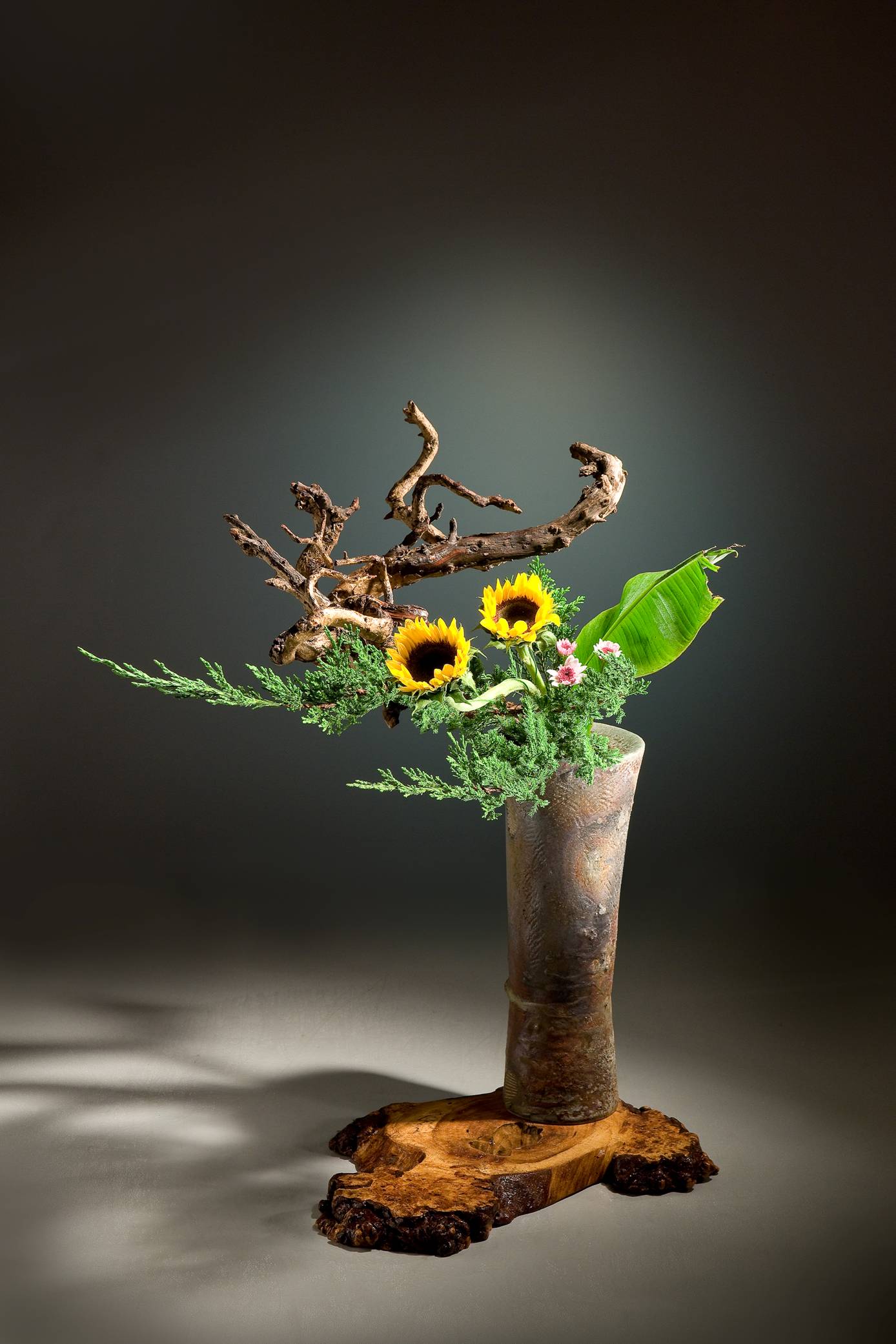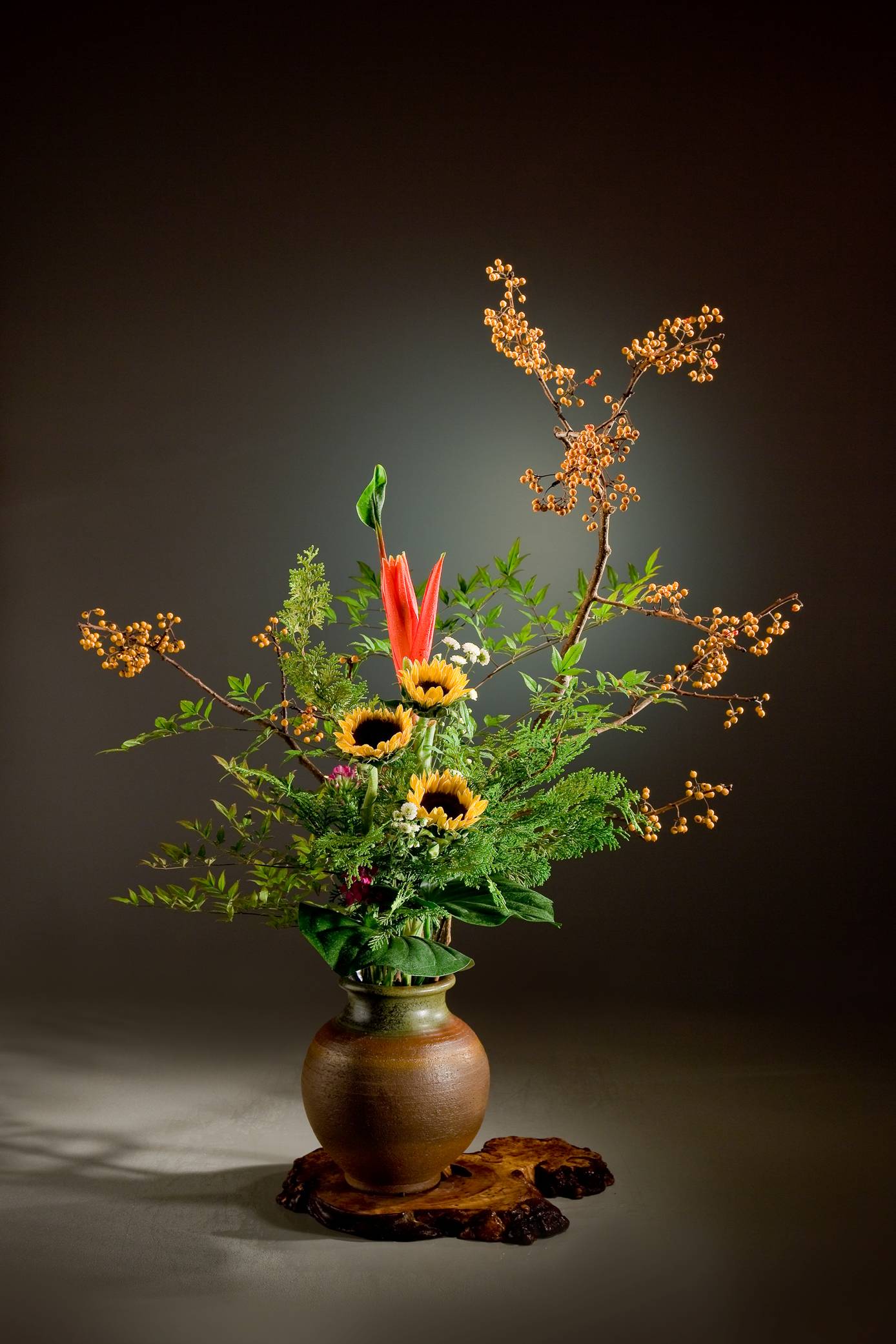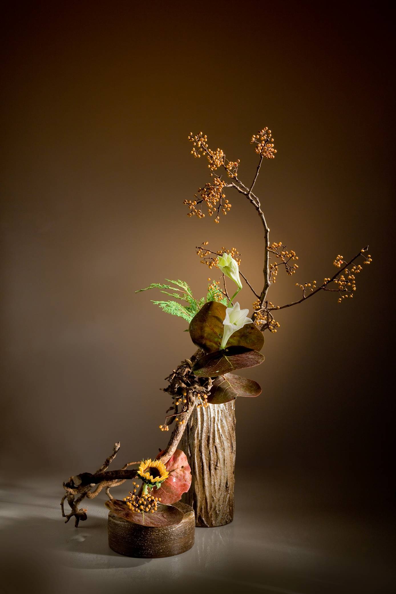 花材:蔓梅擬、鐵砲百合、海葡萄、向日葵、柏、枯木