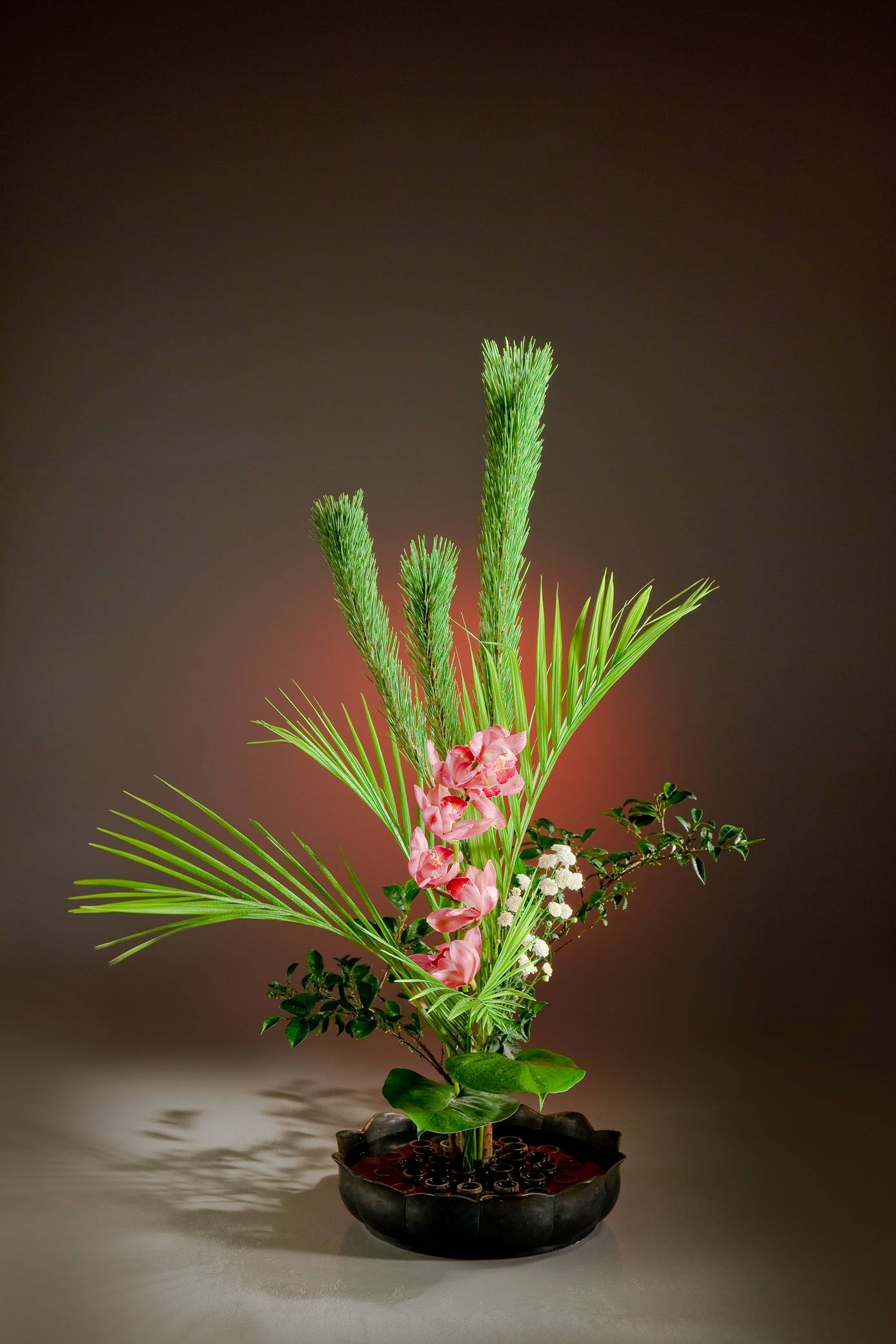 花材:東亞蘭、松、椰子心、小菊、山茶、電信蘭