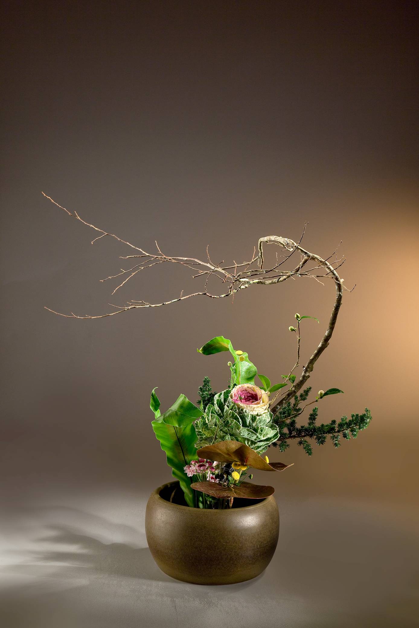 花材:葉牡丹、杜松、山蘇、山茶、小菊、海葡萄、枯木