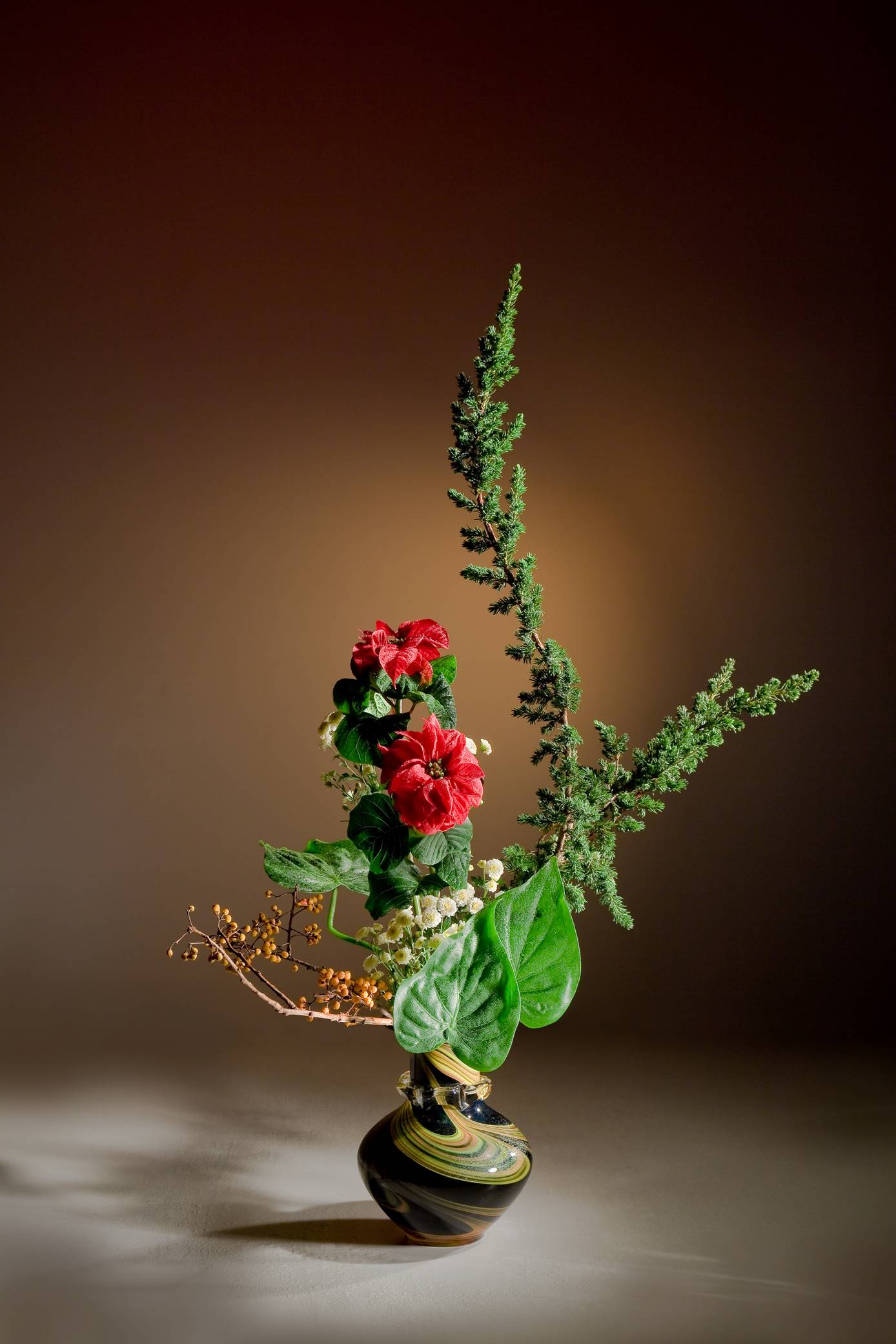 花材:聖誕紅、杜松、芋葉、曼梅擬、小菊