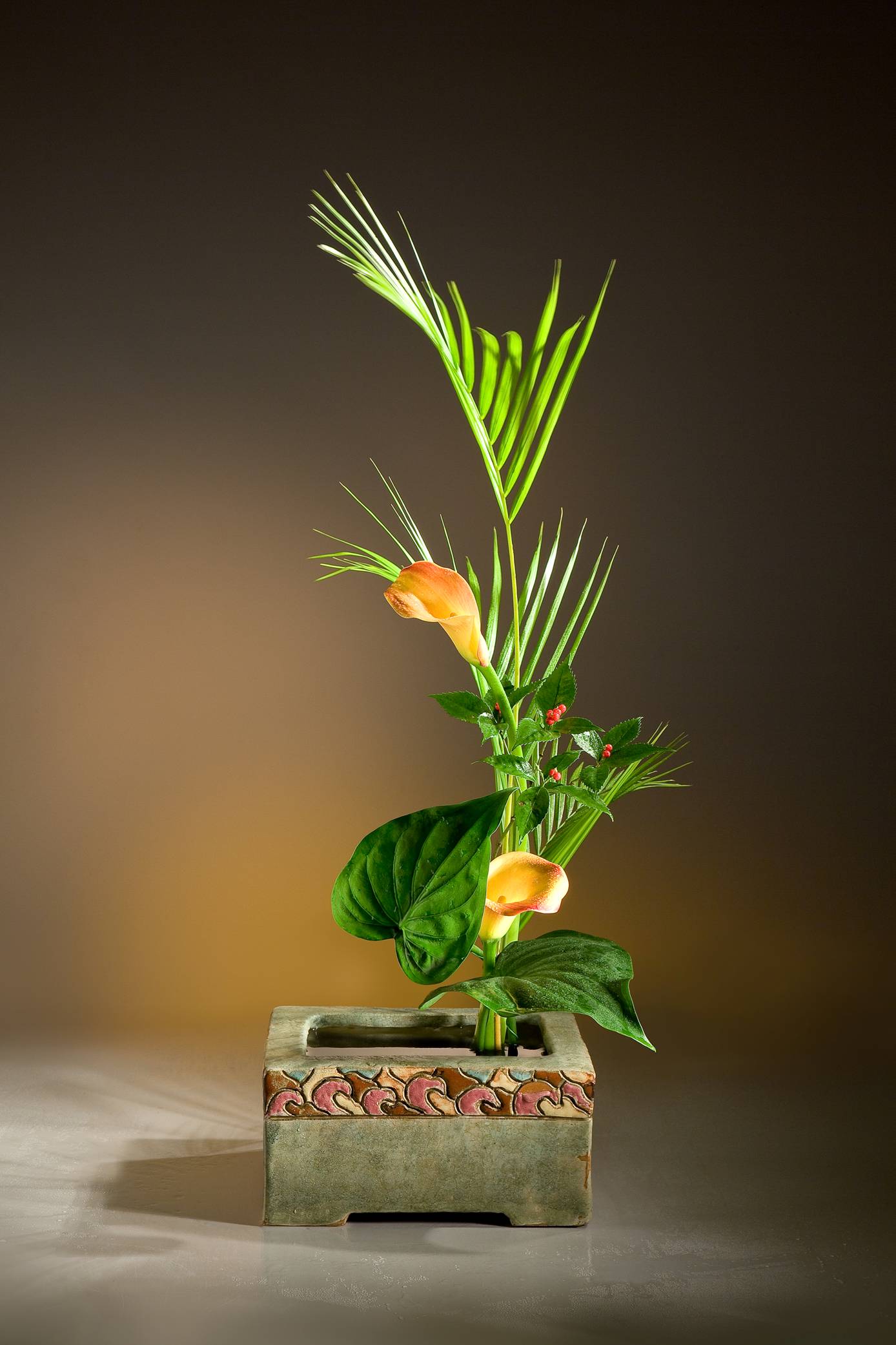 「有生氣」為美的最高條件,椰葉、海芋與芋葉在創意陶中展現向上的生命力。