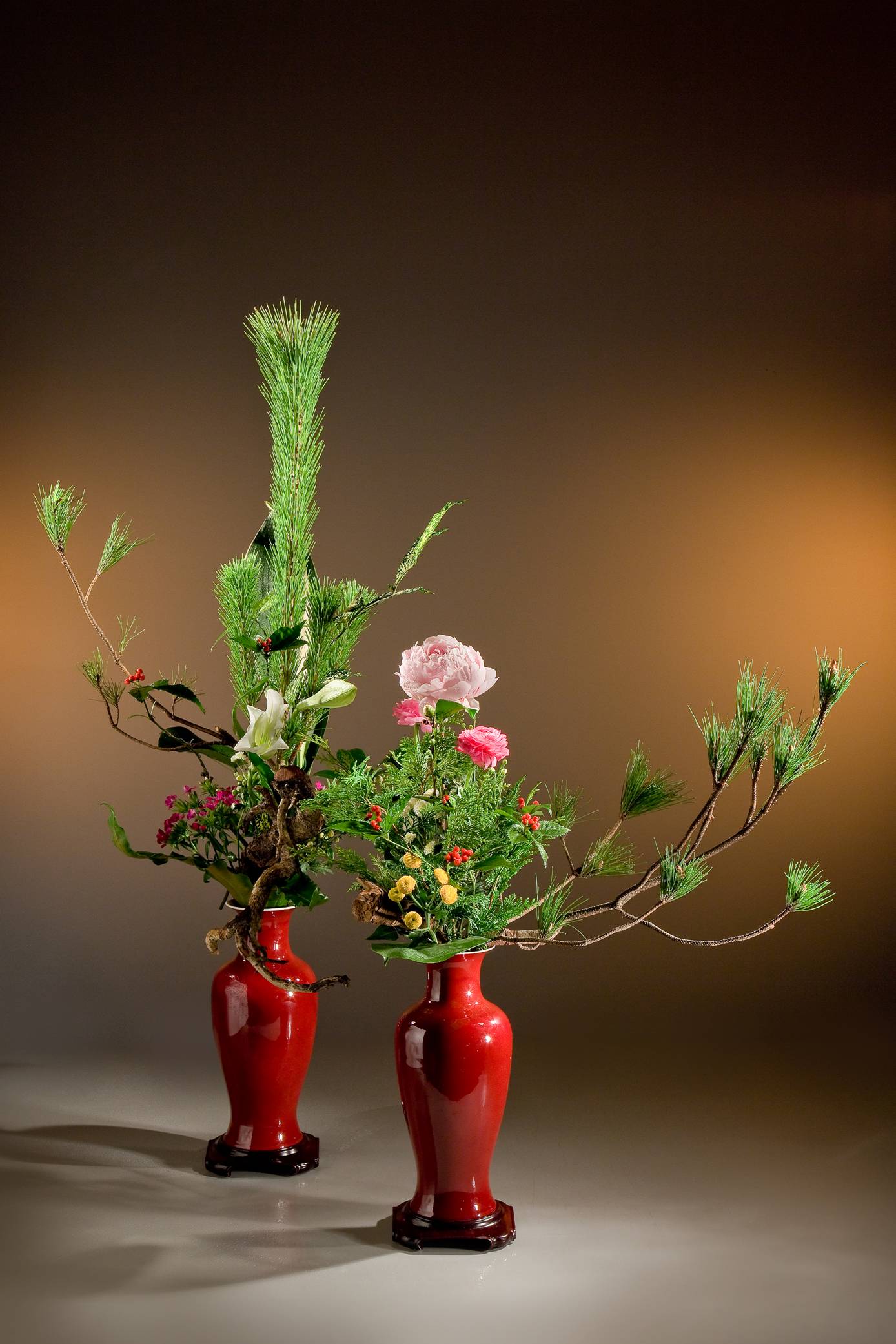 態,麗而不俗。插花創作時取雙紅瓶,插芍藥、松、菊、百合等佳卉芳