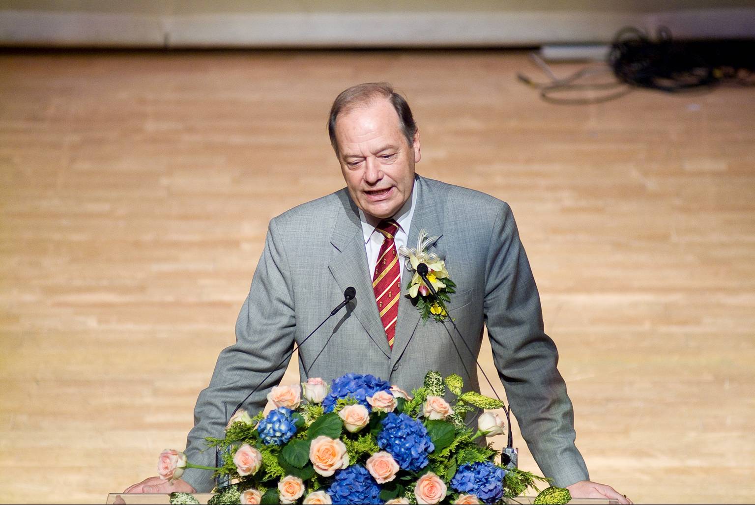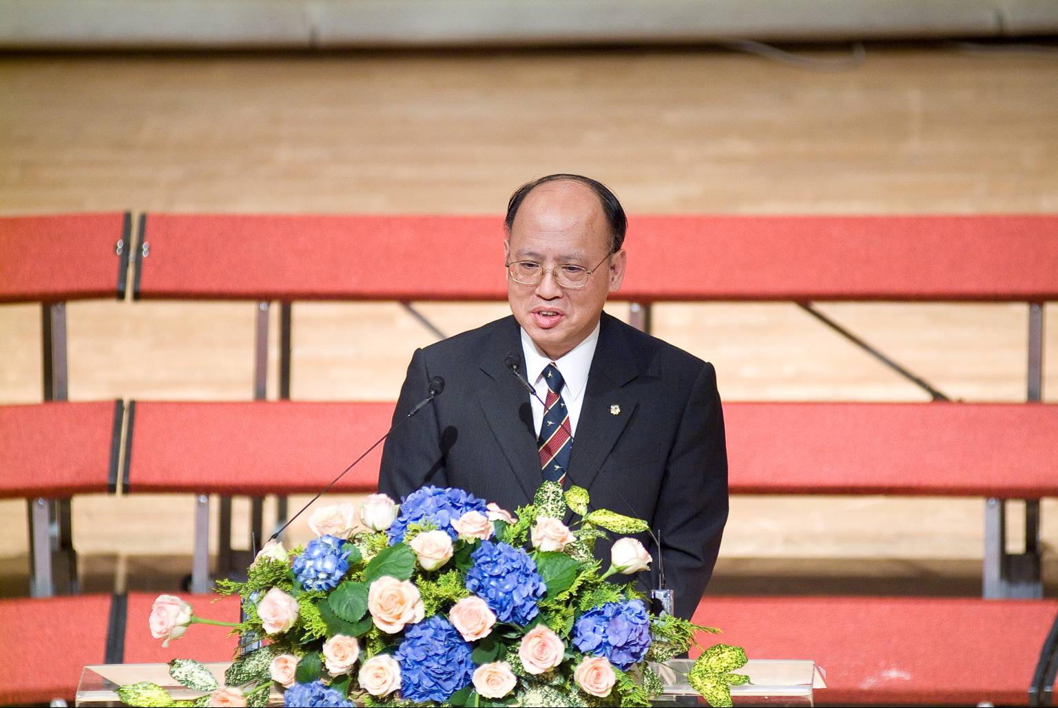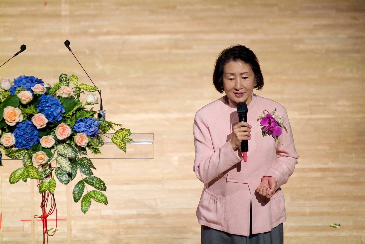 貴賓致詞邀請二位非常重要的貴賓:田玲玲女士也是中華婦女蘭藝社的創始人之一,二十多年中華婦女蘭藝社是中華花藝的推手,也是本會重要的支持者。二十多年前(1988)錢復先生為駐美代表時,因中美兩國無邦交關係,夫人卻突破萬難邀請董事長帶領本會前往「雙橡園」做花藝示範,當時也邀請到許多國家駐美大使的夫人們與會參觀精湛的花藝作品,獲得與會人士的讚美。「雙橡園」是美國重要的古蹟建築,也是電話發明人「貝爾」的祖父所建的一所美麗的莊園。錢夫人緩緩道來令人動容,當時情景還似歷歷在目,一轉眼就二十幾年過去了。她對中華花藝的感情如此的深厚,還鼓勵結業的老師們要繼續努力,聽在新科教授的耳裡,定有一番說不出的情感與感動。