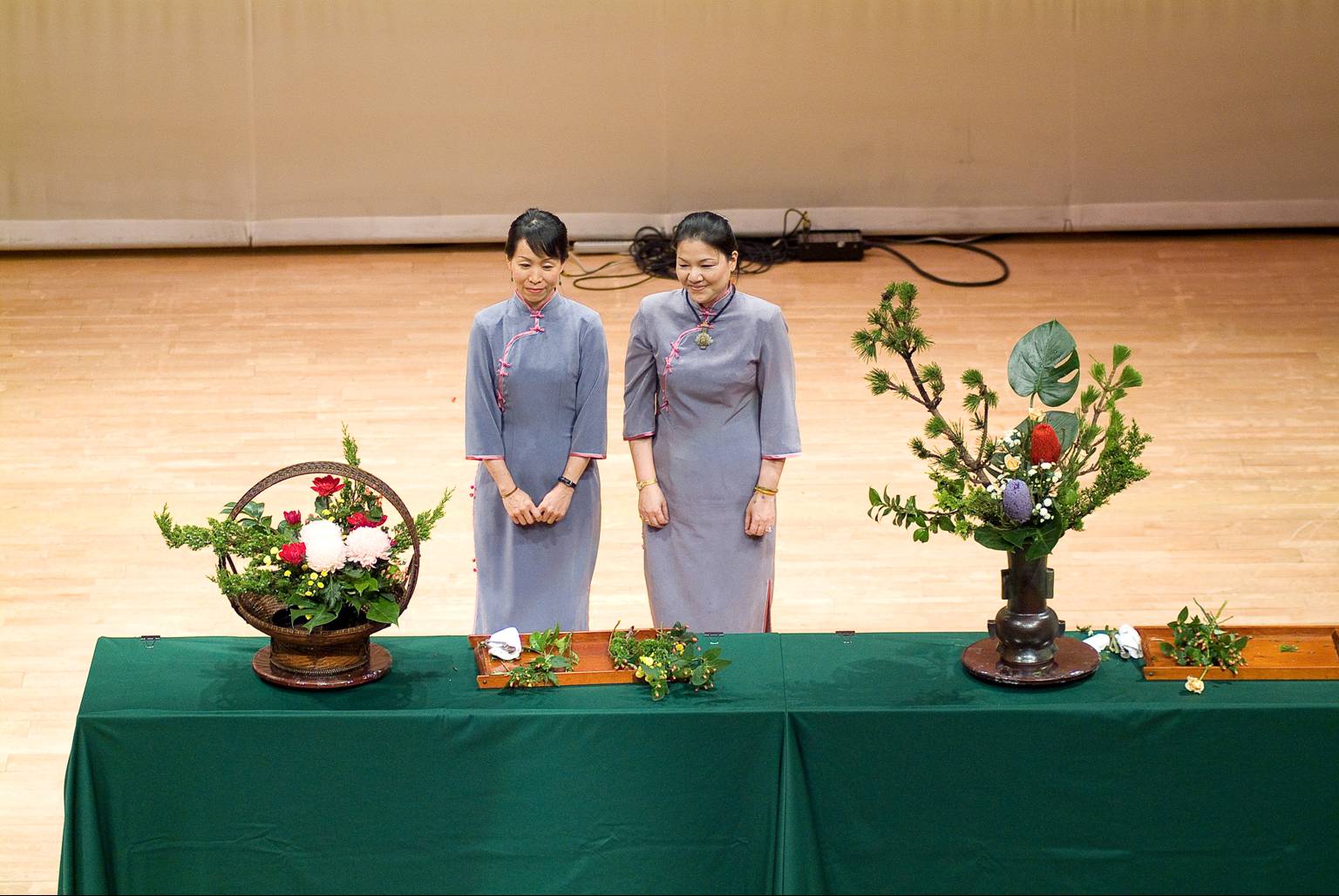 每年會慶都輪流邀請畢業班的花藝教授插花示範,今年輪到第十九屆由賴雪麗、楊金鑾二位老師,楊老師示範院體籃,賴老師示範瓶。