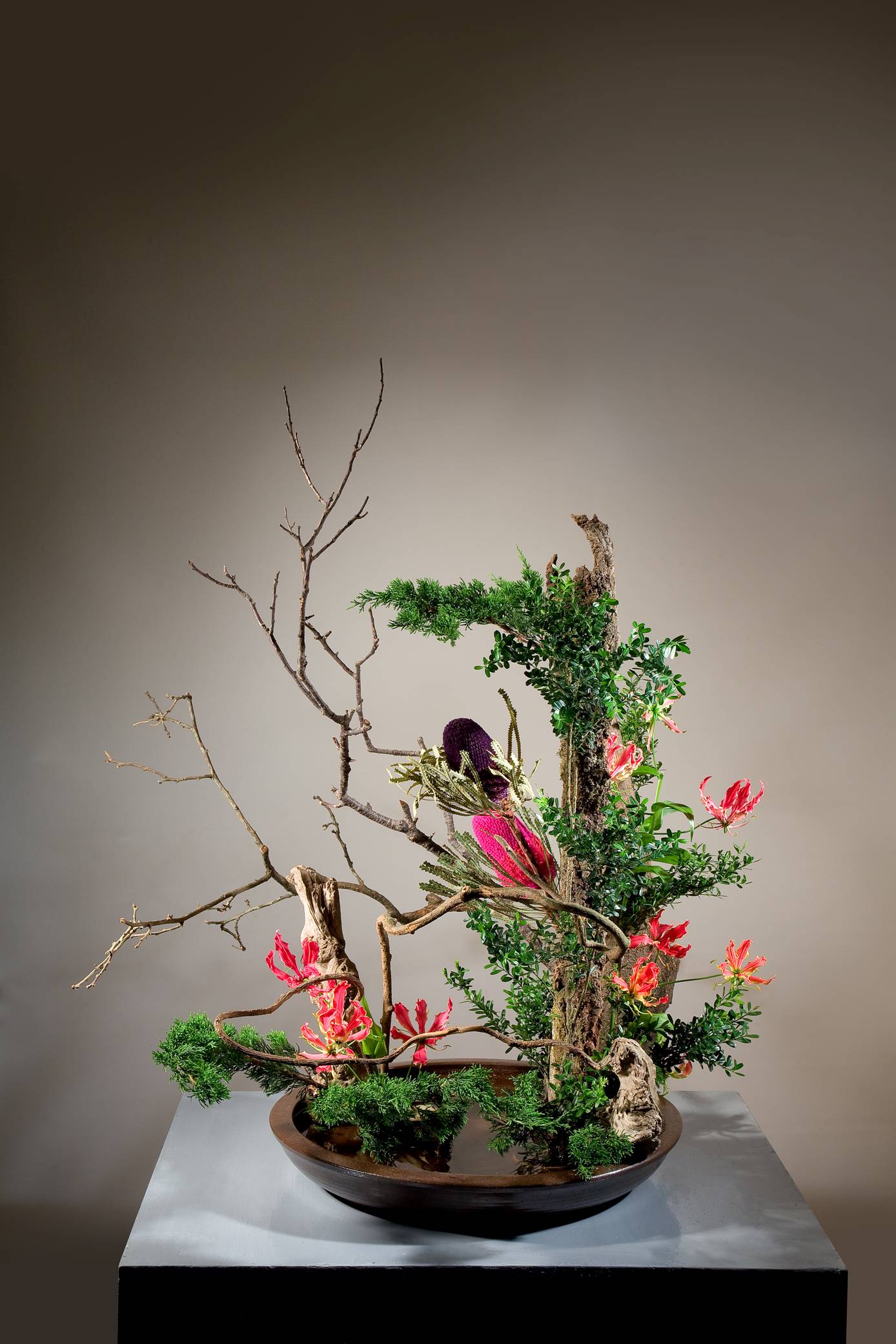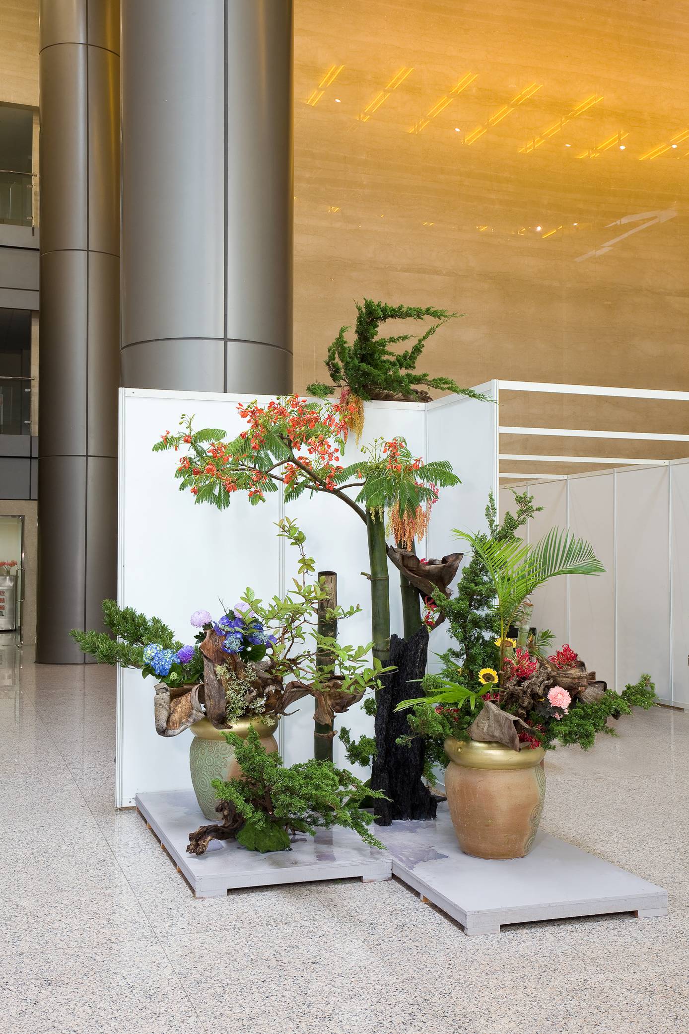 花材:海芙蓉、文竹、海樹、初雪草、仙人果、 花材:海神、火焰百合、柏、藤、櫻花枝、金柳、樹皮