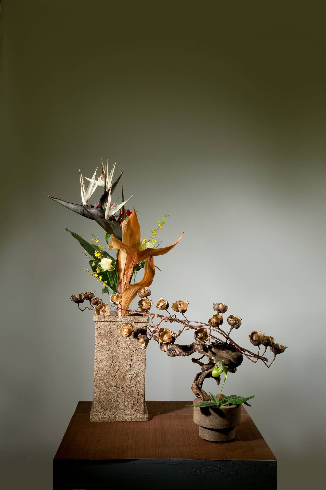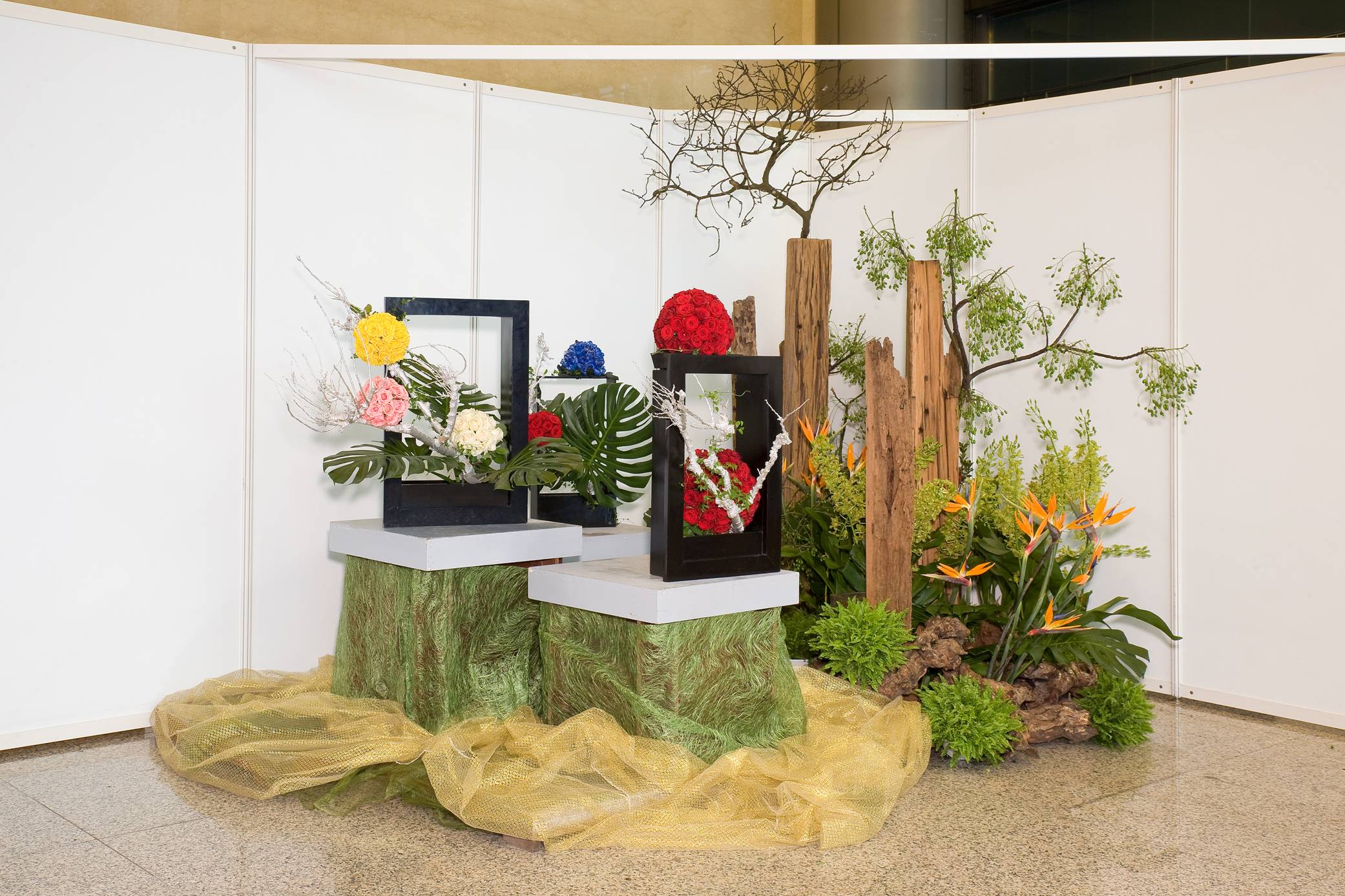 花材:芭蕉、番石榴、柏、菊花、美人蕉、 花材:天堂鳥、玫瑰、蘭花、苦楝子、梔子花、