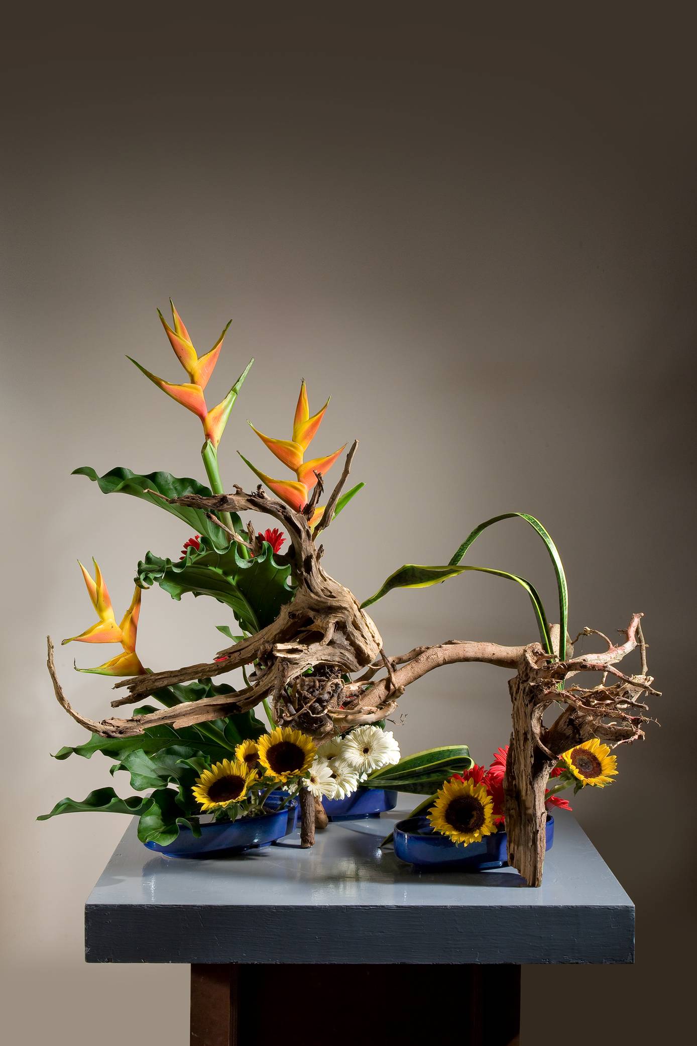 花材:林投、蘭花、夕霧草、文竹、翠珠花、 花材:赫蕉、向日葵、太陽花、山蘇、虎尾蘭、枯木