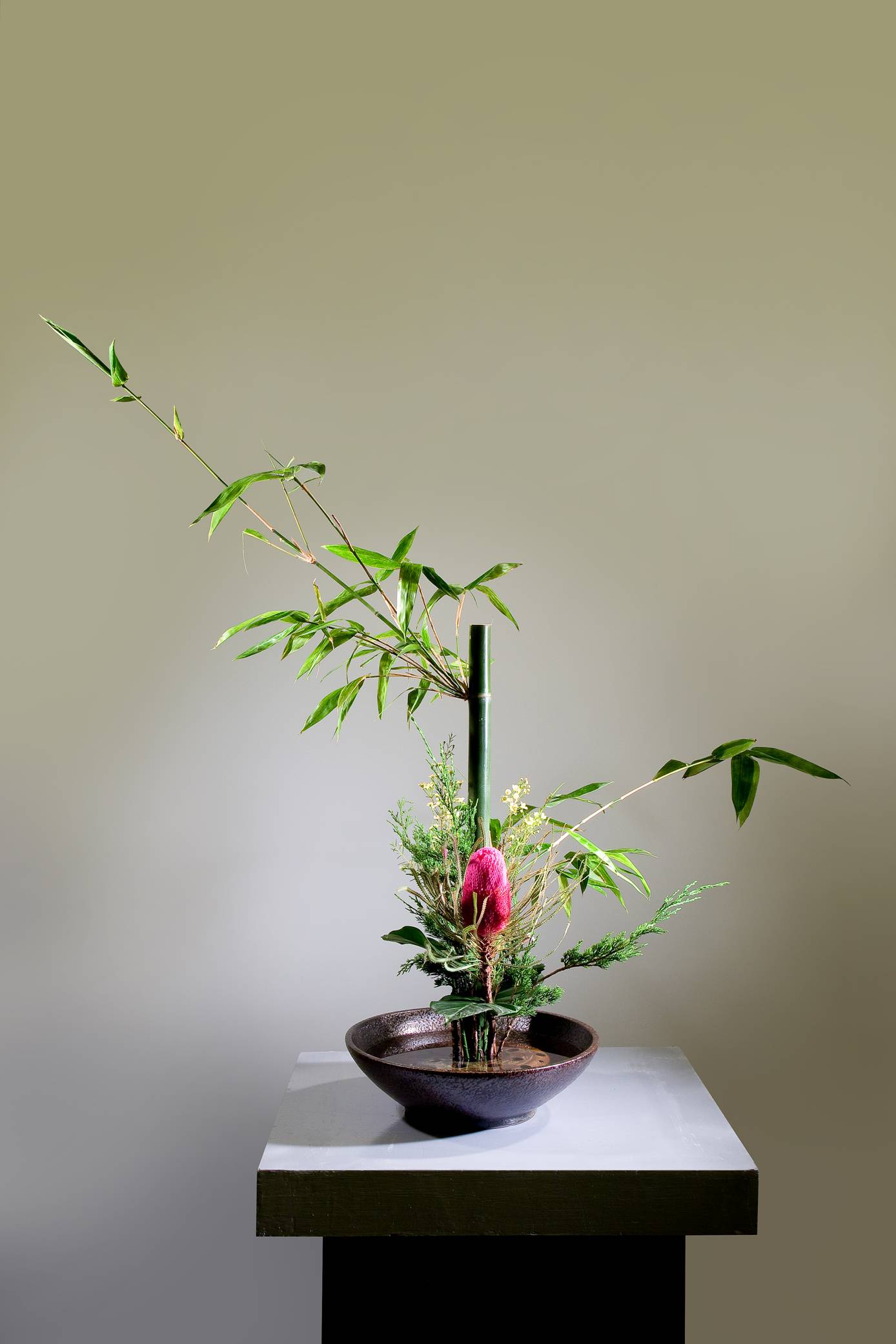 瓶花形體高昂,象徵宗廟、高堂、或崇山峻嶺,理念花最適宜表現,如六合十全之插作,作品莊嚴肅穆。
