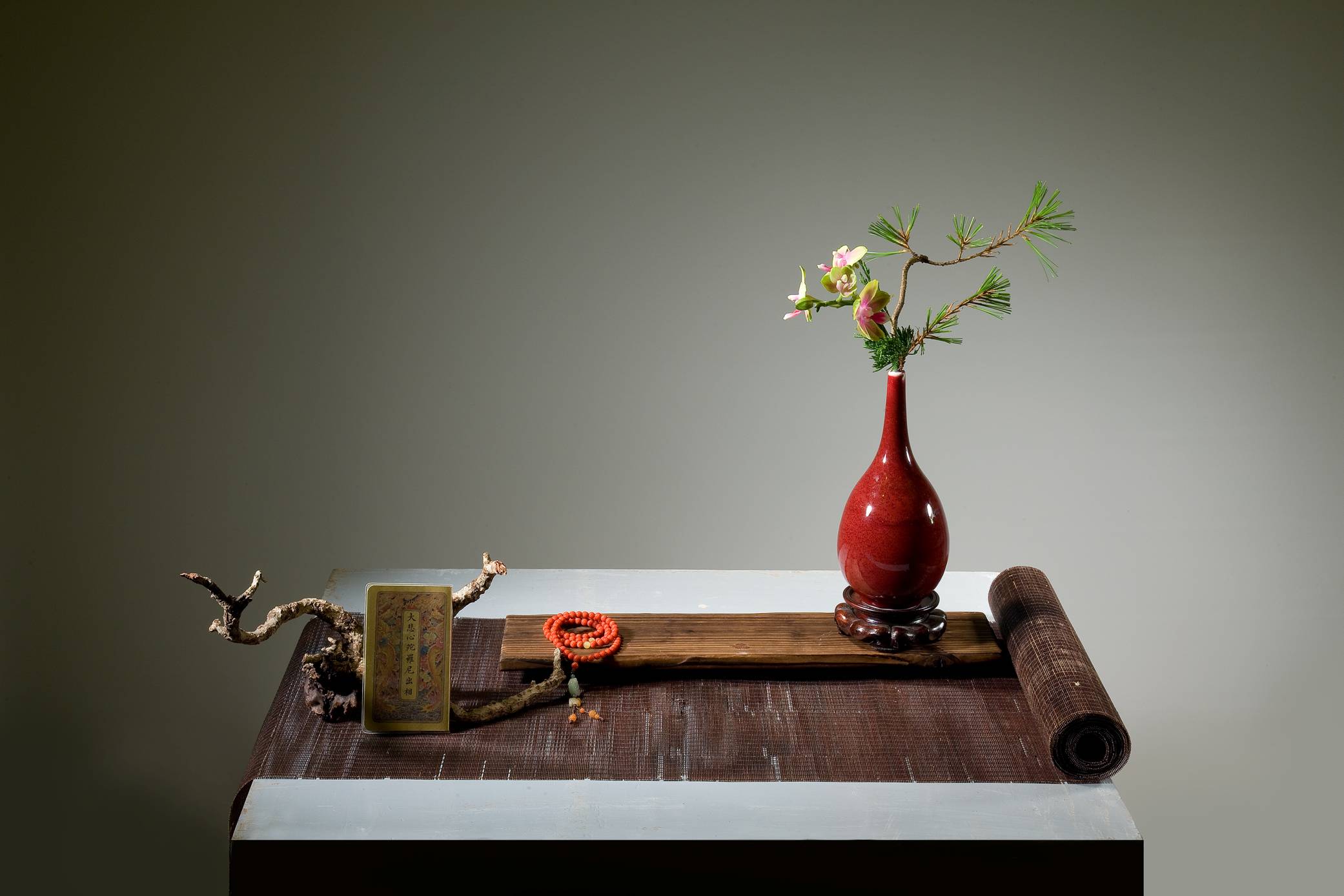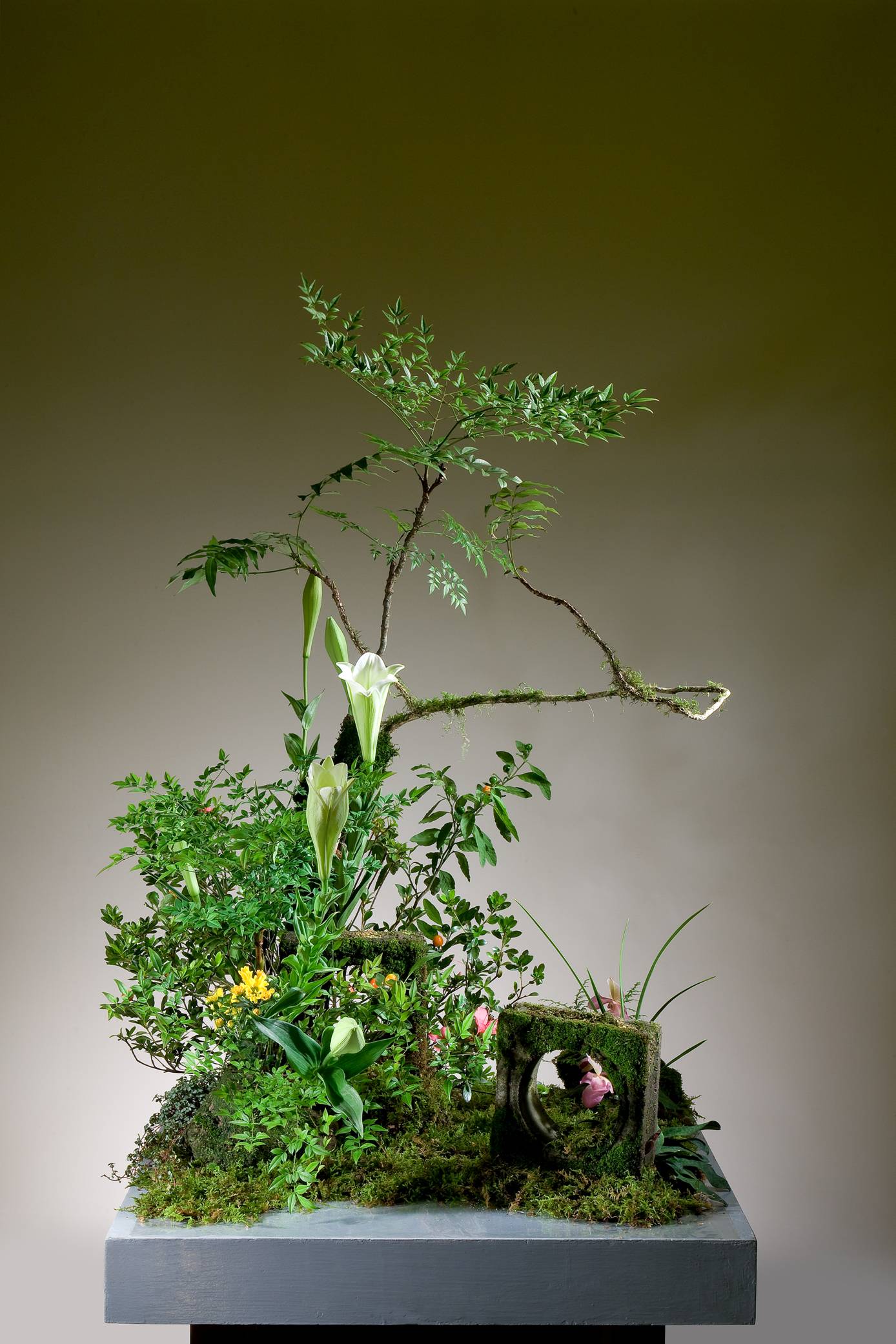 花材:鐵砲百合、射干、孔雀葉、紅珊瑚、苦楝子、鳶尾 花材:南天、苔藤、鐵砲百合、蘭花、小菊、杜鵑、苔、山蘇