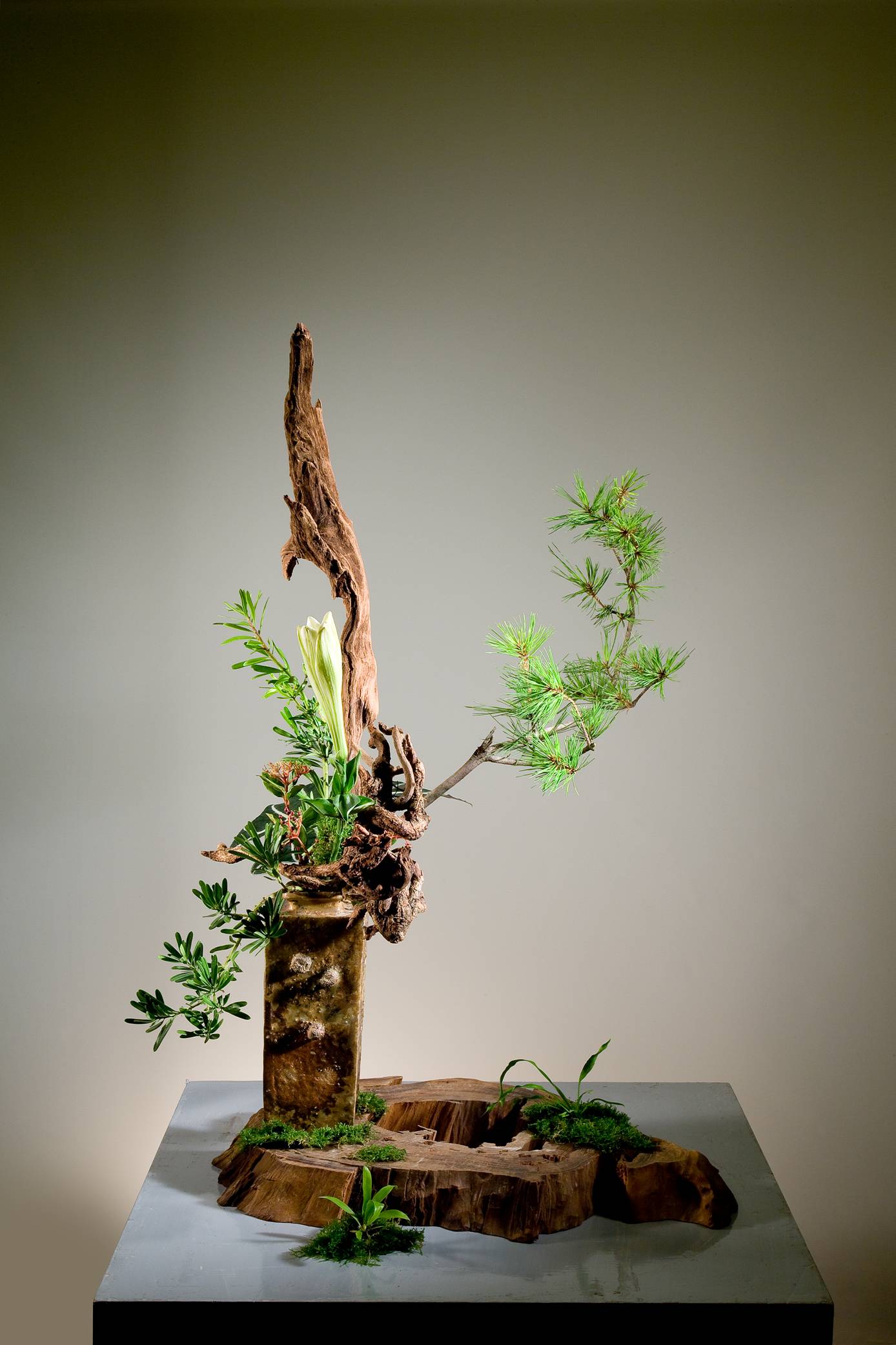 花材:海神、乾蓮蓬、乾椰殼、柏、牛角茄、 花材:松、羅漢松、鐵砲百合、雪球果、山蘇、苔、枯木
