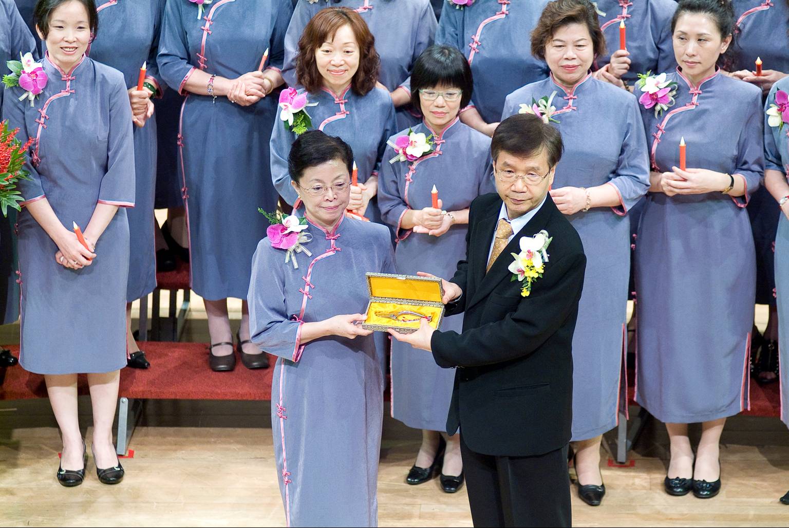 25屆花藝教授授證典禮,由董事長頒發 董事長頒發金錯刀,林文麗班長代表接受。