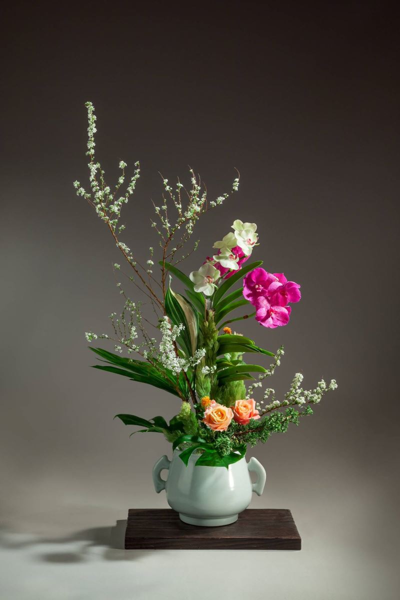 花材: 桃花、東亞蘭、巨輪萬代蘭、大理花、深山櫻、柏、雪柳、