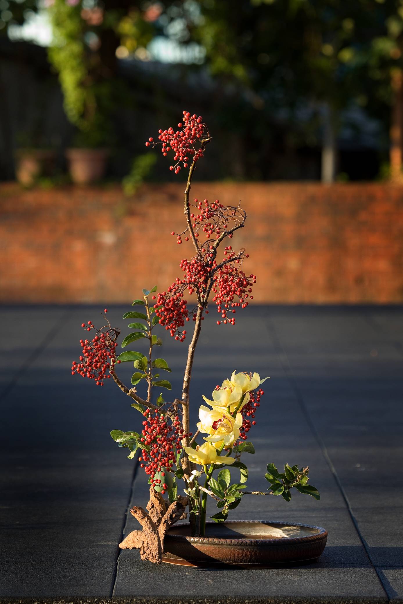 花材:咪咪草、金鳳菊、小菊、山茶、枯木、木瓜葉