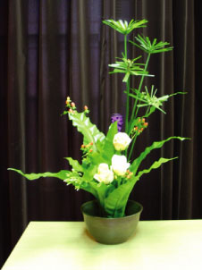 2.花材若用山蘇,要加以修剪或折葉,不要插成如象腳。山蘇須展開勿太直,長短互搭,上下自然接應、有深度、密而不亂有層次空間。兩株應呼應為一個整體的作品。