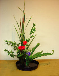枝腳也是欣賞的一部份,勿凌亂。比例、花材的方向都要注意,使枝宜多曲。基盤要夠要有層次。