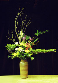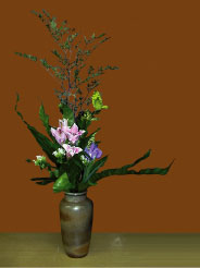 中華插花的瓶花應有架勢,勿軋緊無空間,手腳要舒展出來。沒有架勢就沒有輪廓沒有能量,也就不會動人。架勢靠三主枝之長短、前後、左右的安排,角度要拉出來,但放得太過也會不調和的。藝術的拿捏靠經驗,比例對、整體平穩、枝腳清閟,注意每朵花的表情,基盤也要夠才會穩健。