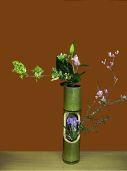 筒花大多表現單面佔兩疇,材料少,乾淨利落,簡潔明朗高雅,重線條。枝腳要乾淨,但太乾淨易生硬;撒的做法很重要,要自然不要太過囉唆,太過累贅,撒做得漂亮對作品往往有加分的效果。一般以自然枝所做的ㄚ字撒最佳。勿插得太多、太滿、缺少輕盈的美感。枝腳宜穩健,有虛靈的空間。