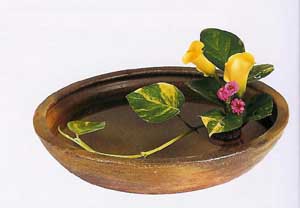 平舖型最合平而設計原理,重二度空間機能,以黃金葛葉為使客枝,替代水生植物,也是花材的應用法之一。