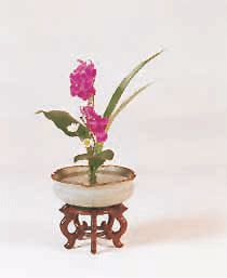 一日無意間瞥見櫥窗內一只瓷碗,碗身平實,顏色古樸,便隨手將之拿下,發現碗心立有一雙蟾除,宛如池中戲水一般,隨性所至,便想效法古人插花,以兩蟾蜍間的縫隙取代劍山,信手拈來,將蝴蝶蘭夾其縫隙之中;蝴蝶蘭高貴幽雅,坐穩器中,再佐以著莪為從,完成碗花。古碗與蘭相襯,頗有君子雅士其芳自賞之意趣。古人云:「山中豐草綠,乎有清風起,幽蘭人不知,品味是高足」,自是如此。
