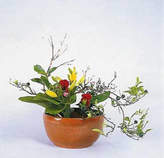 插作方法 : 1、花型三點插,必須注意塊體與枝的調和。 2、使枝桔仔長度7,倒掛使成三叢,尾端要回心為佳,副使枝取兩叢也倒掛而插,兩株枝腳有相有依偎感。 3、客枝長度為5,向前屈與「使」枝動態一致,但表情應與主枝互應,副客插於東北走向,成後景之體。 4、主花山丹長度為3,另加副花雞冠、小薔薇,增加色彩之豐富感。 5、基盤為玉簪葉,三立足點於奧點、窔點、東點之向天轉盤。 6、各塊體的動向應順應使與副使之走向。