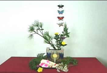 花材:兩葉松、倒柏、黃菊、紫菊、