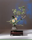 「松惟靈木,百本之長」,松,別稱不老,仙友、木公、五大夫 …。在東方畫上,松配薔薇被題上不老長春,把靈芝和鶴搭配松,則題上「松鶴遐齡」。詩人愛詠松、畫家愛畫松,蒼松已成為理想人格的象徵,花藝家以松、竹、菊插作於古銅瓶,亦隱含君子直道而行的深意,擺飾於客廳最為合適。