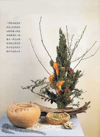 花材:龍柏、紅海芋、苔黃楊、白桃花、紅翠菊、芙蓉、貝殼沙、小黑石沙、樹皮 花器: 造型陶﹙許旭倫先生提供﹚ 花型:寫景造型